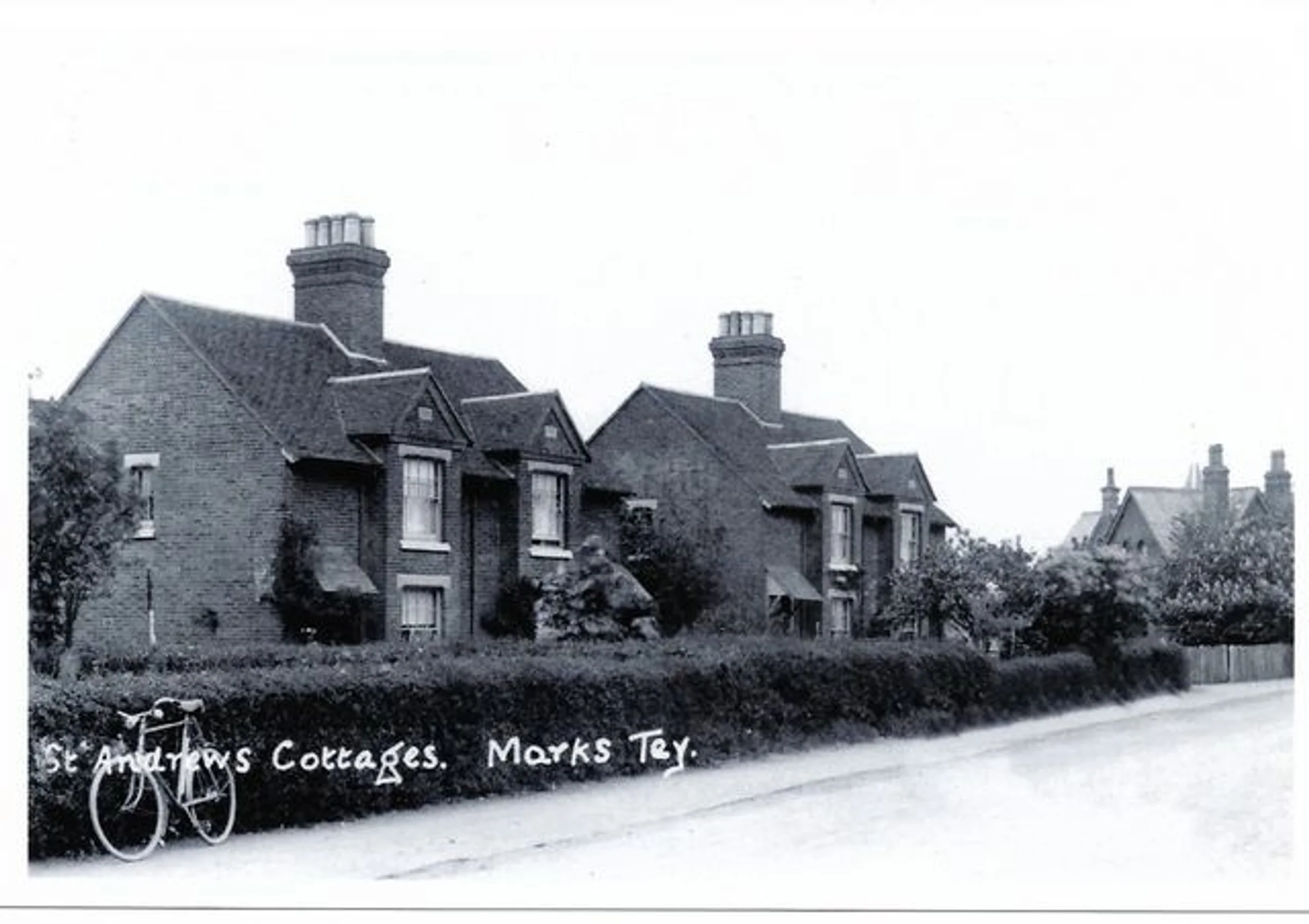 St Andrews Cottages were on London Road. There were four cottages and here there is a bicycle leaning against the hedge. There are sale particulars dated 1910 (probably with copyright restriction). The rent was £14.10.00 a year with the sale taking place at The Prince of Wales. The school building is on the right.