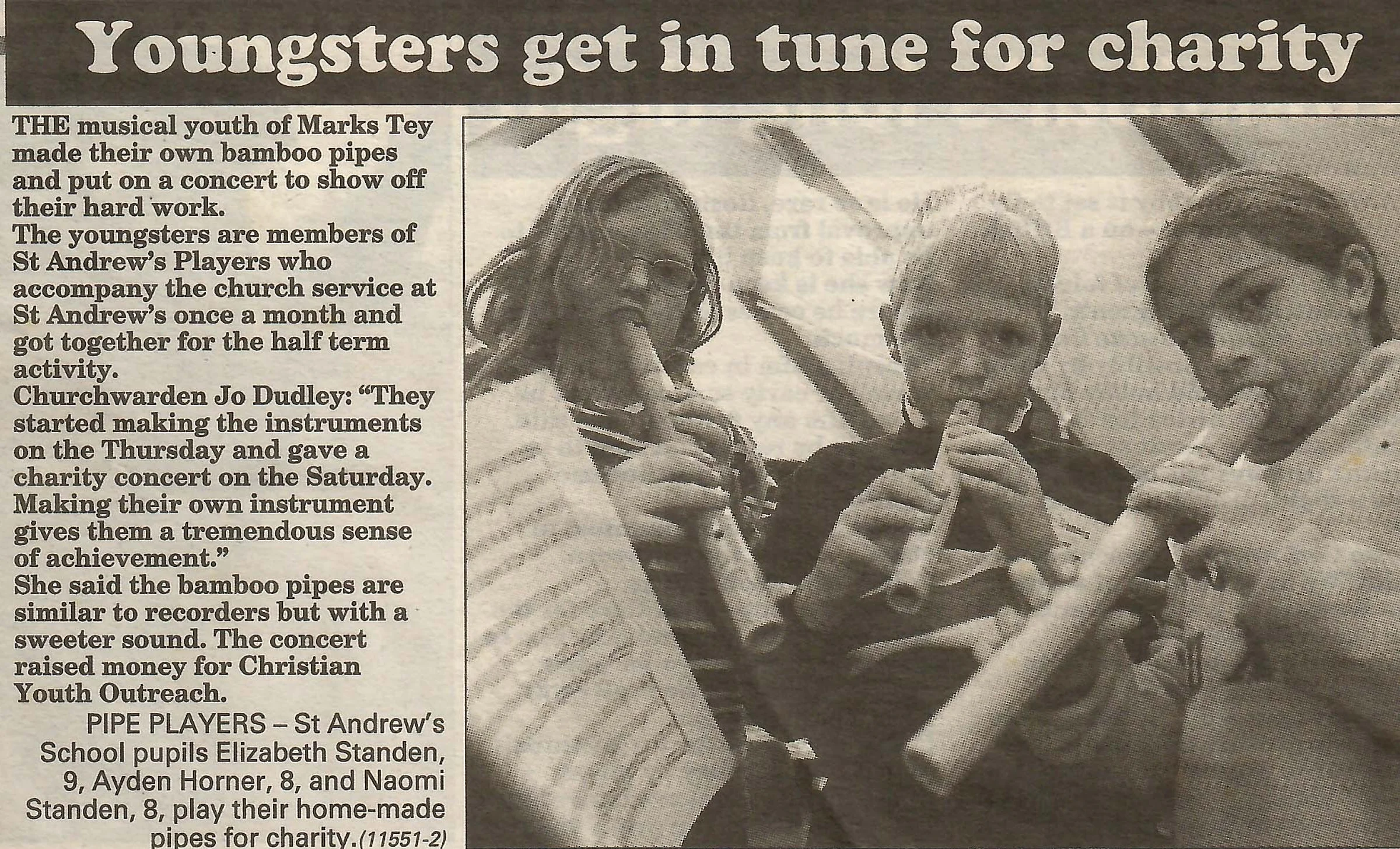 Newspaper article and photograph reporting on a bamboo pipe concert by the St Andrew’s Players.