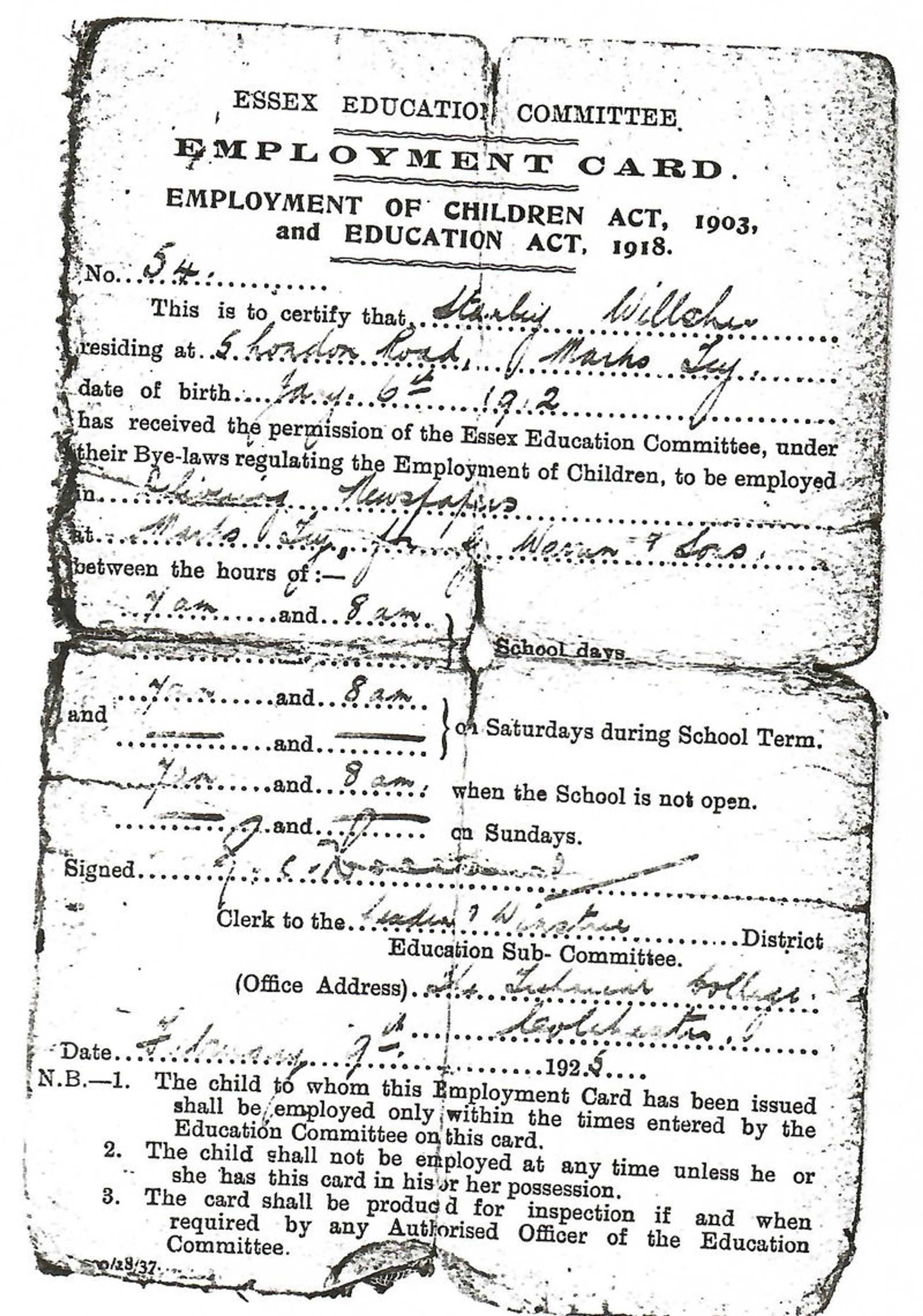 Stanley Willsher of 5 London Road (probably demolished and near the present entrance to the Parish Hall) was born on 6 January 1912. In February 1925 at the age of 13 he needed an Employment Card to deliver newspapers for an hour every morning for G. Warren at the Post Office and grocer’s shop.