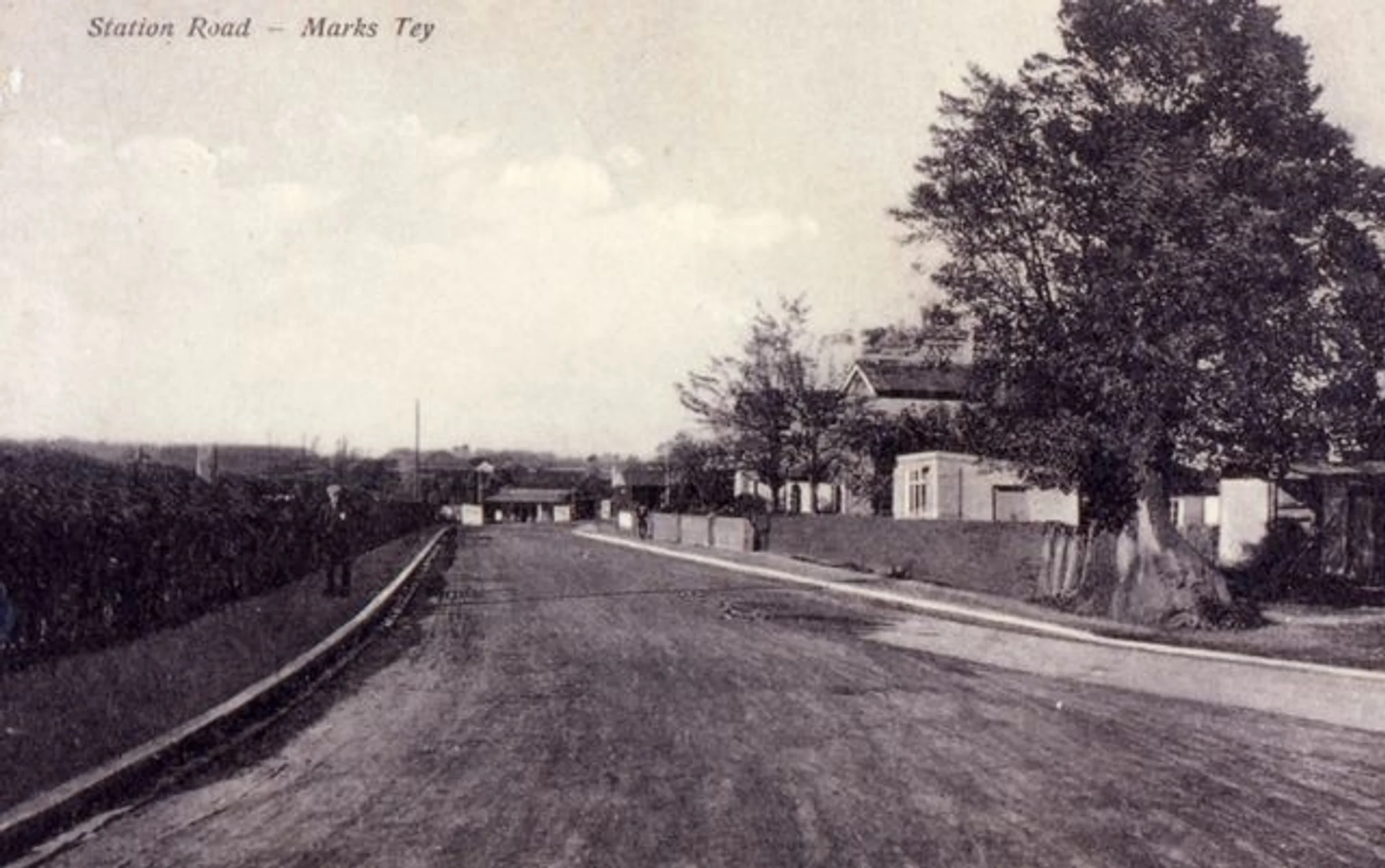 Two versions of a view down Station Road towards the railway station. There is an older man approaching on the pavement on the left and another man further away on the right.