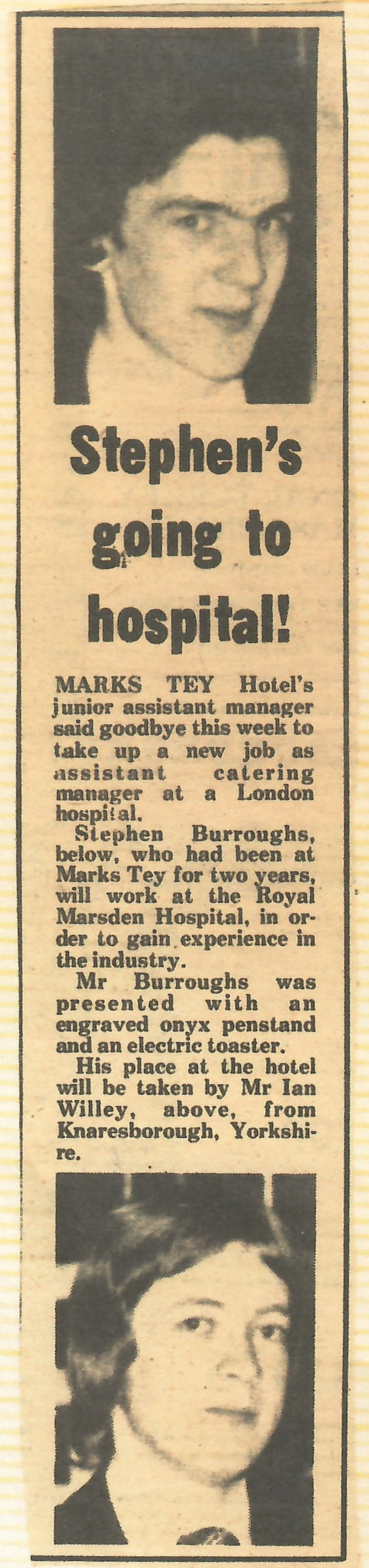 Stephen Burrough is leaving the staff at the hotel after two years to take up a job at the Royal Marsden Hospital. His replacement will be Ian Willey from Knaresborough.