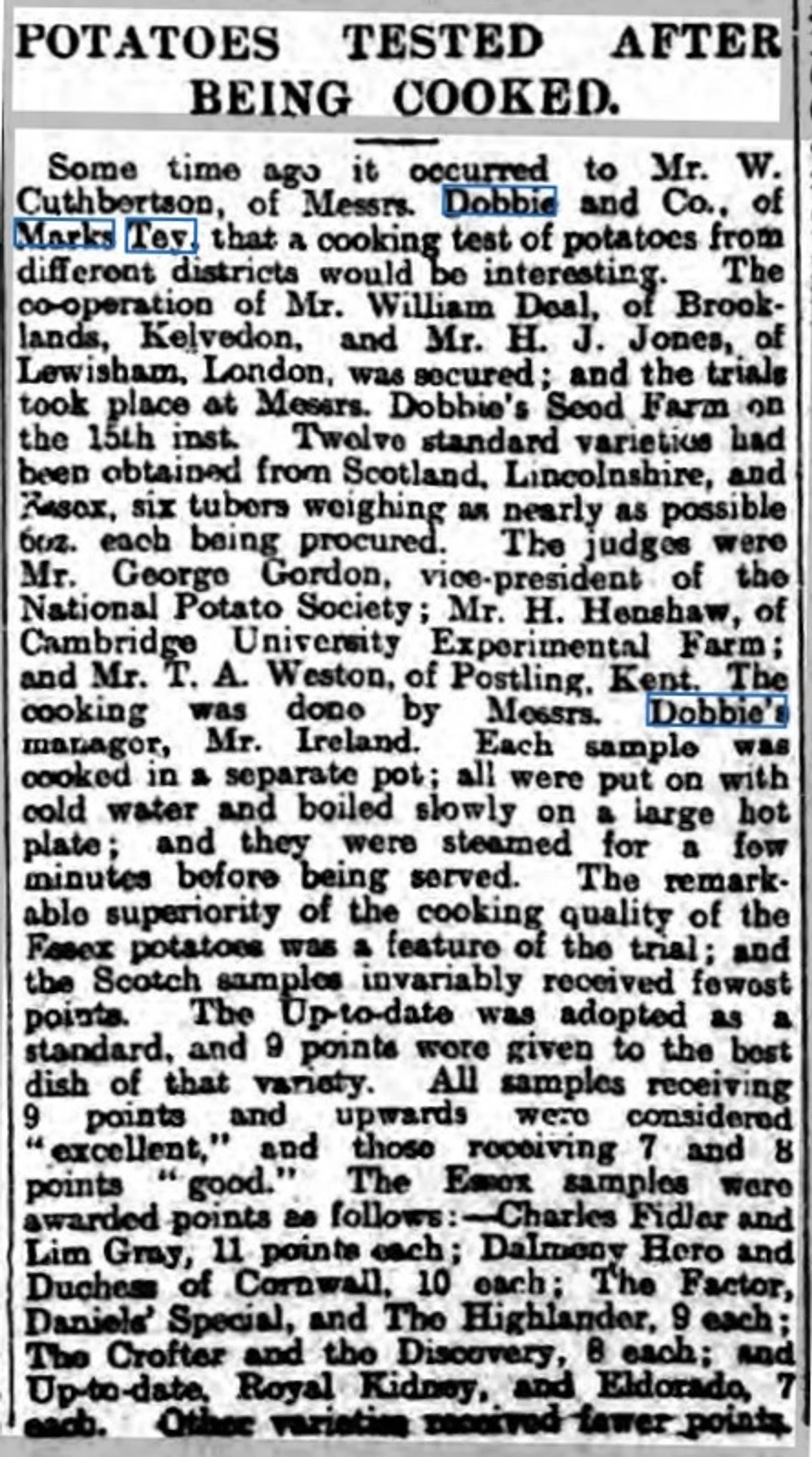William Cuthbertson decided to carry out testing of cooked potatoes to see how the various varieties compared. Mr Ireland, manager at Dobbies did the cooking, boiling them and steaming them before being served.