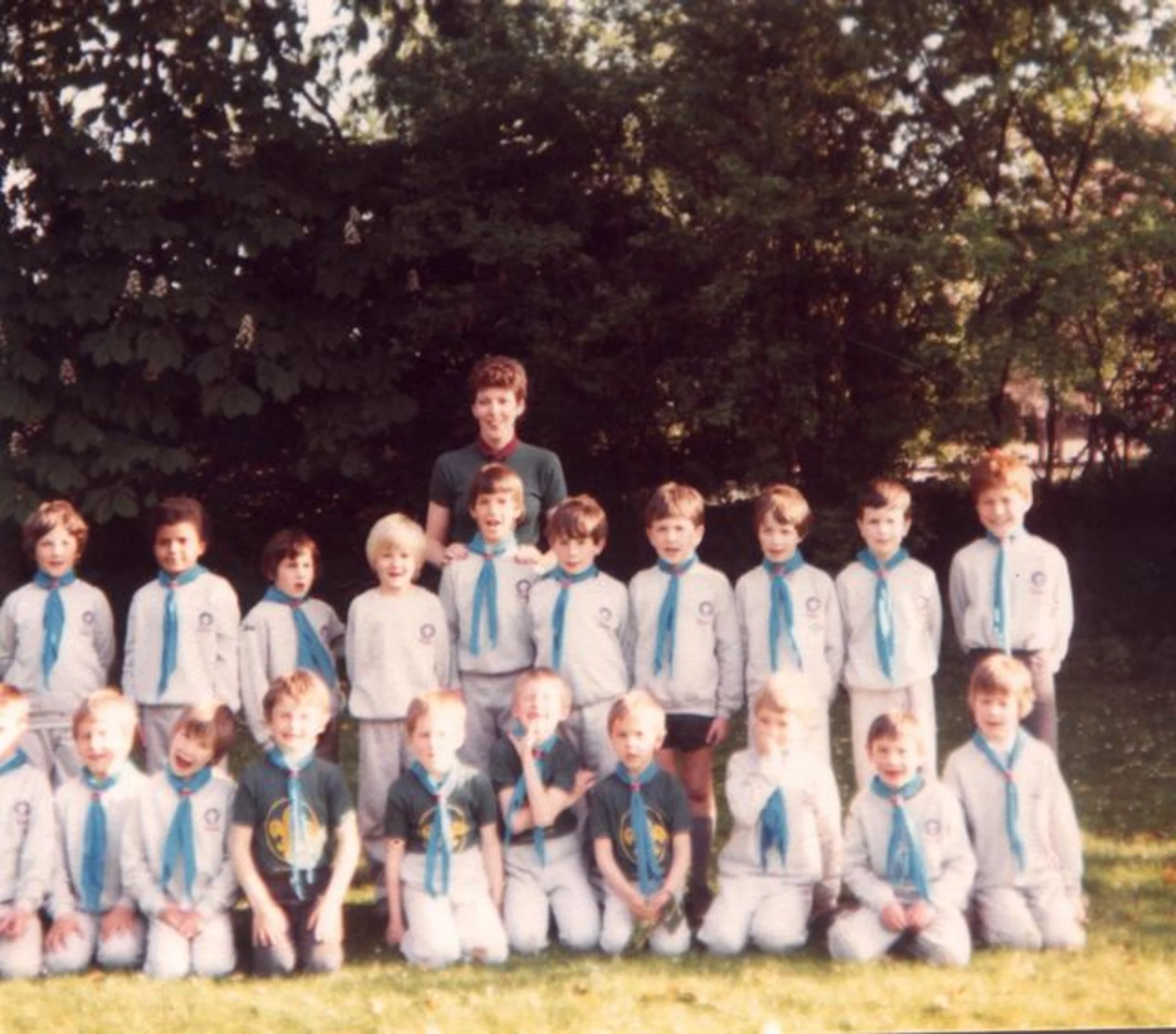 Undated photo of the Beaver group, front row kneeling and back row standing with one leader at the back. The location might be the front lawn of the former Rectory.