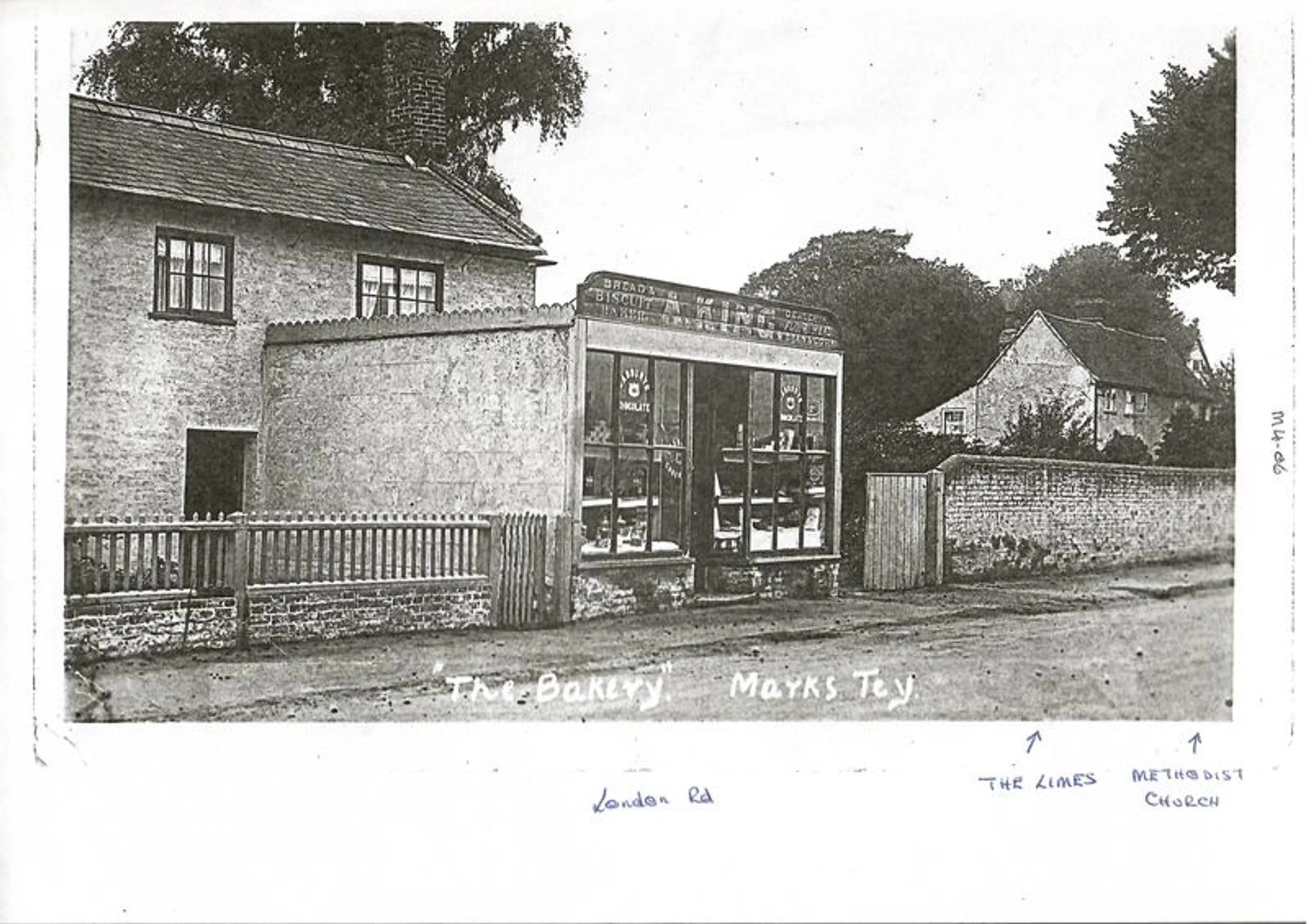 An undated photo of the bakery run by A King. The labelling says the bakery was on London Road along from the The Limes and the Methodist church. The census returns show that Albert King was at this address (then in Aldham parish) in 1891 and 1901 but not in 1911 when his son-in-law was running the bakery.