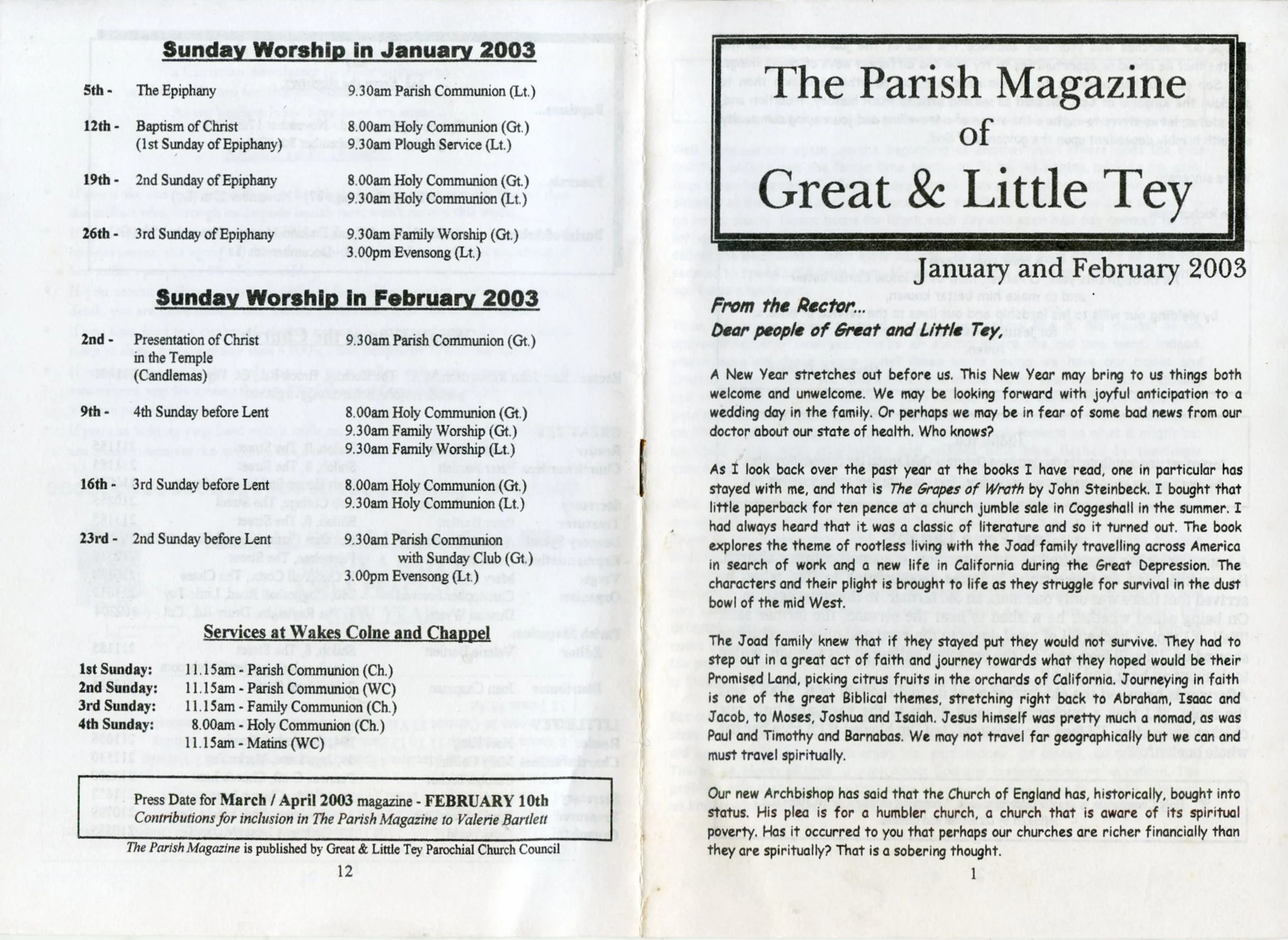Selected pages from the Parish Magazine of Great Tey and Little Tey, January and February 2003.