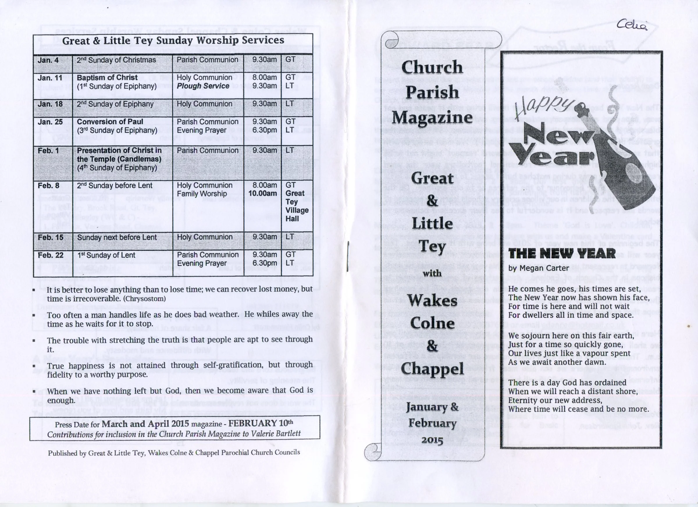 Selected pages from the Parish Magazine of Great Tey and Little Tey, January and February 2015.