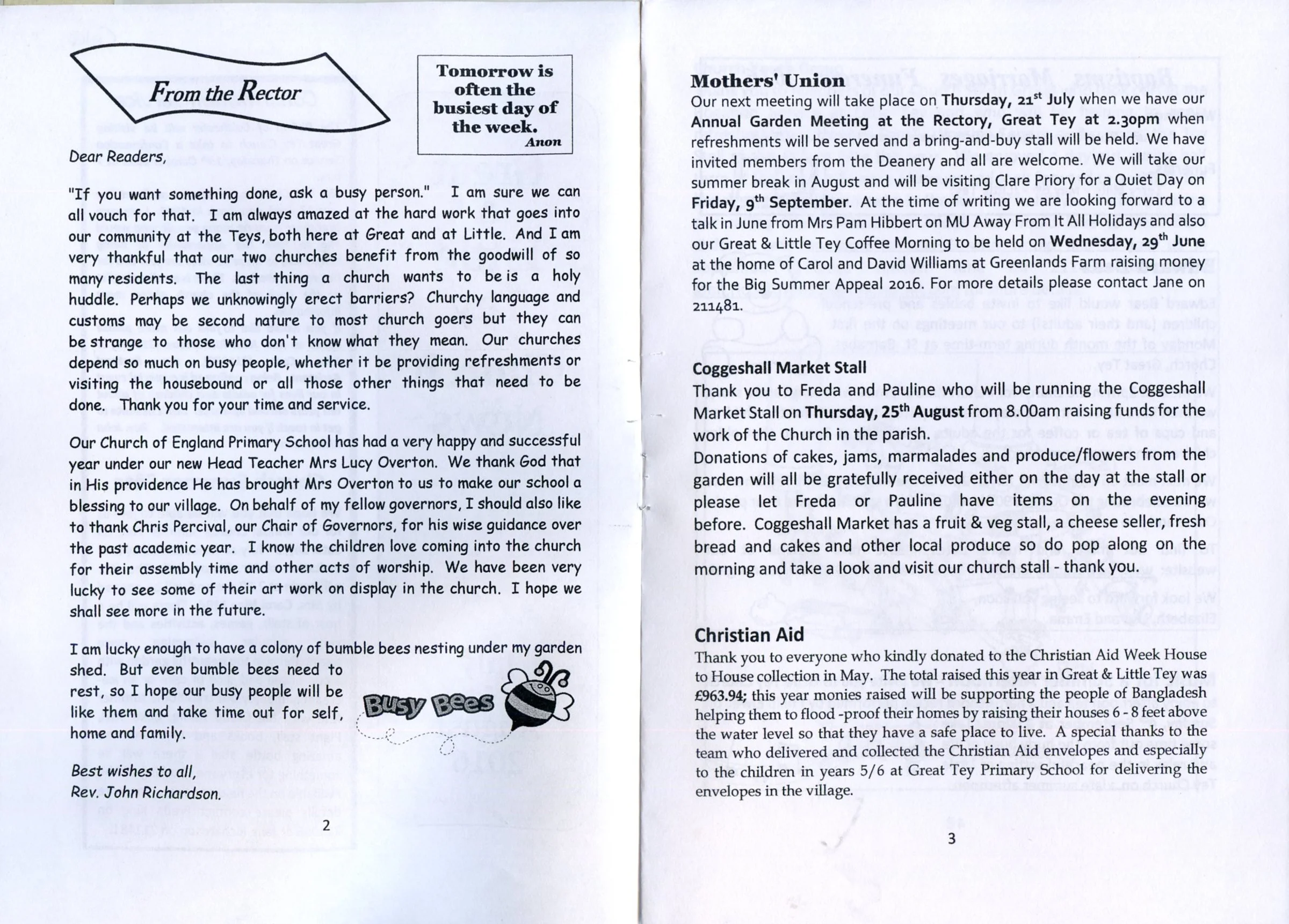 Selected pages from the Parish Magazine of Great Tey and Little Tey, July and August 2016.