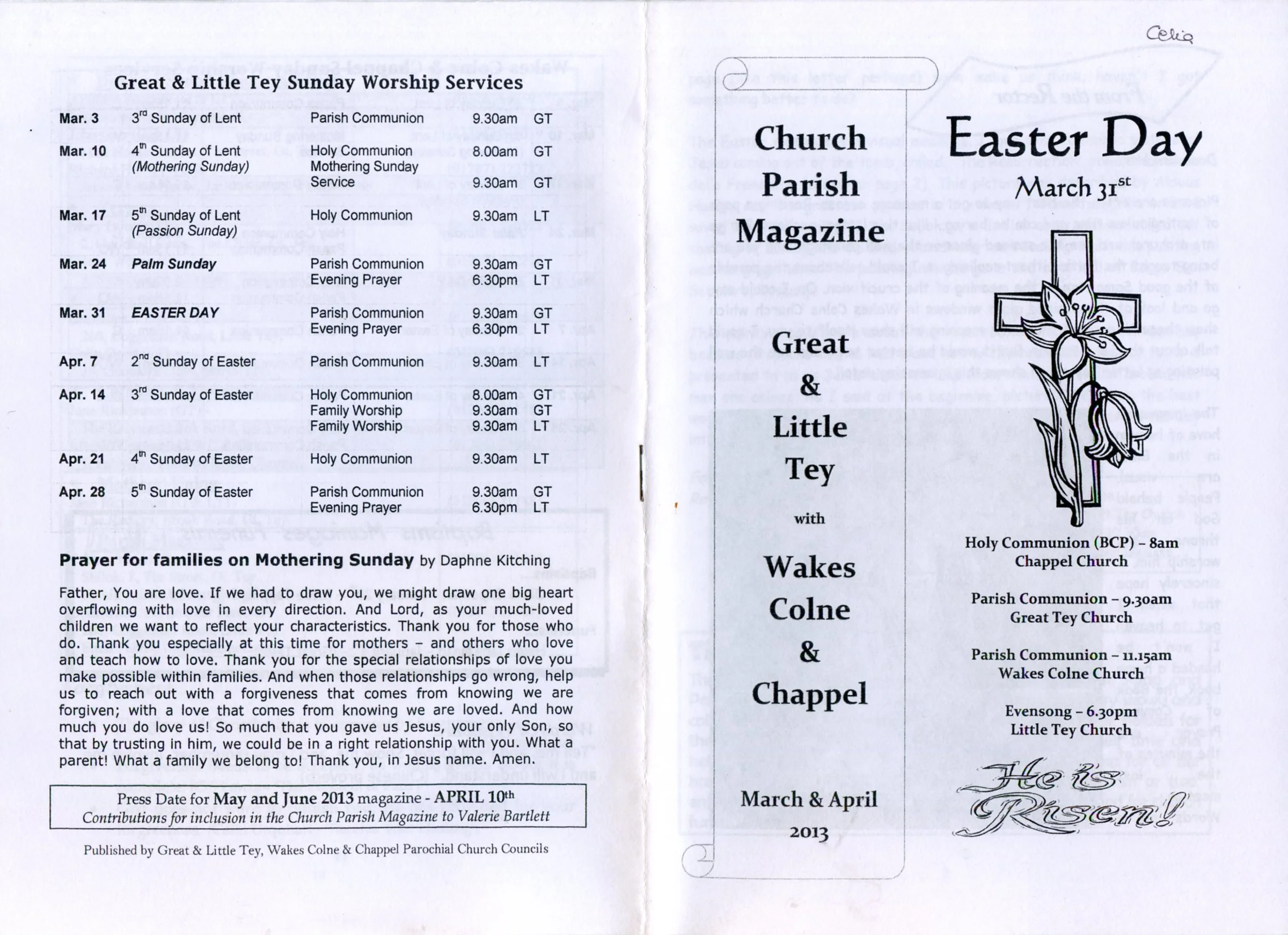 Selected pages from the Parish Magazine of Great Tey and Little Tey, March and April 2013.