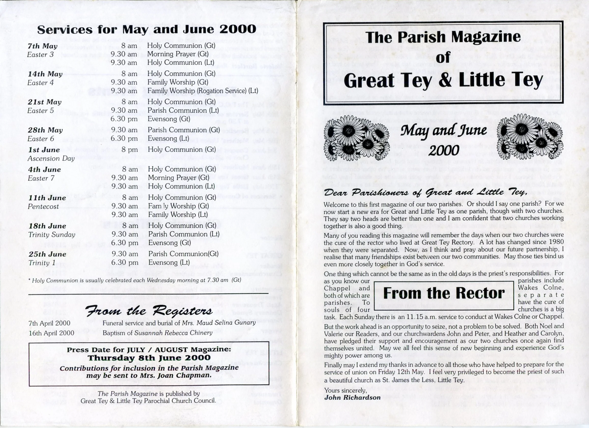 Selected pages from the Parish Magazine of Great Tey and Little Tey, May and June 2000.