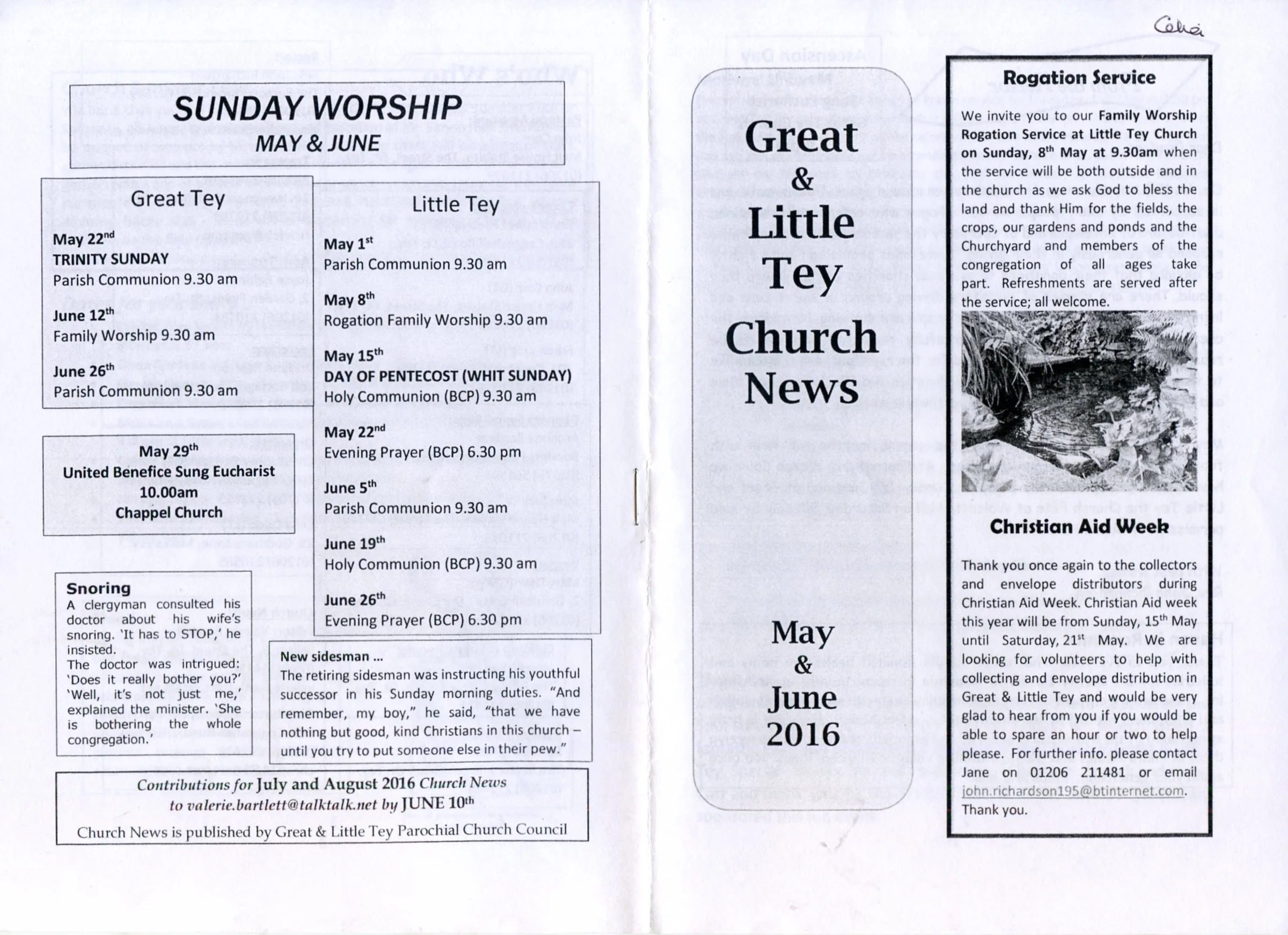 Selected pages from the Parish Magazine of Great Tey and Little Tey, May and June 2016.
