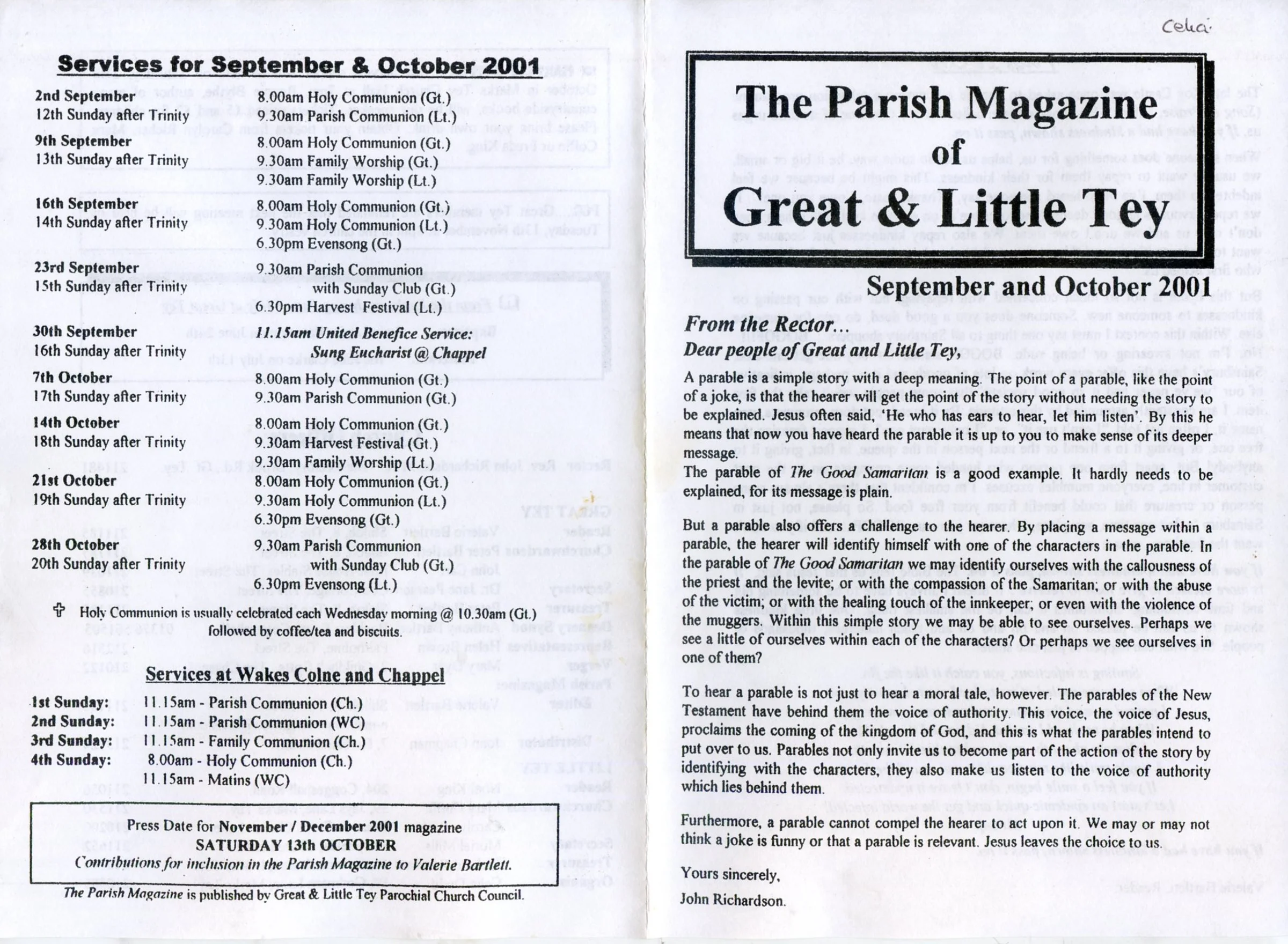 Selected pages from the Parish Magazine of Great Tey and Little Tey, September and October 2001.