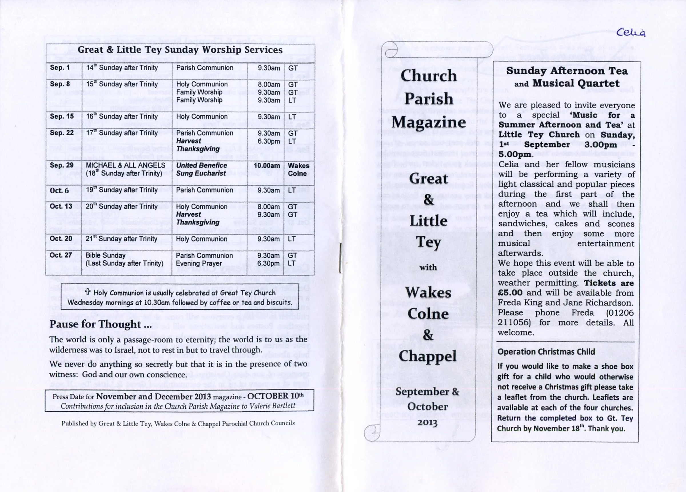 Selected pages from the Parish Magazine of Great Tey and Little Tey, September and October 2013.