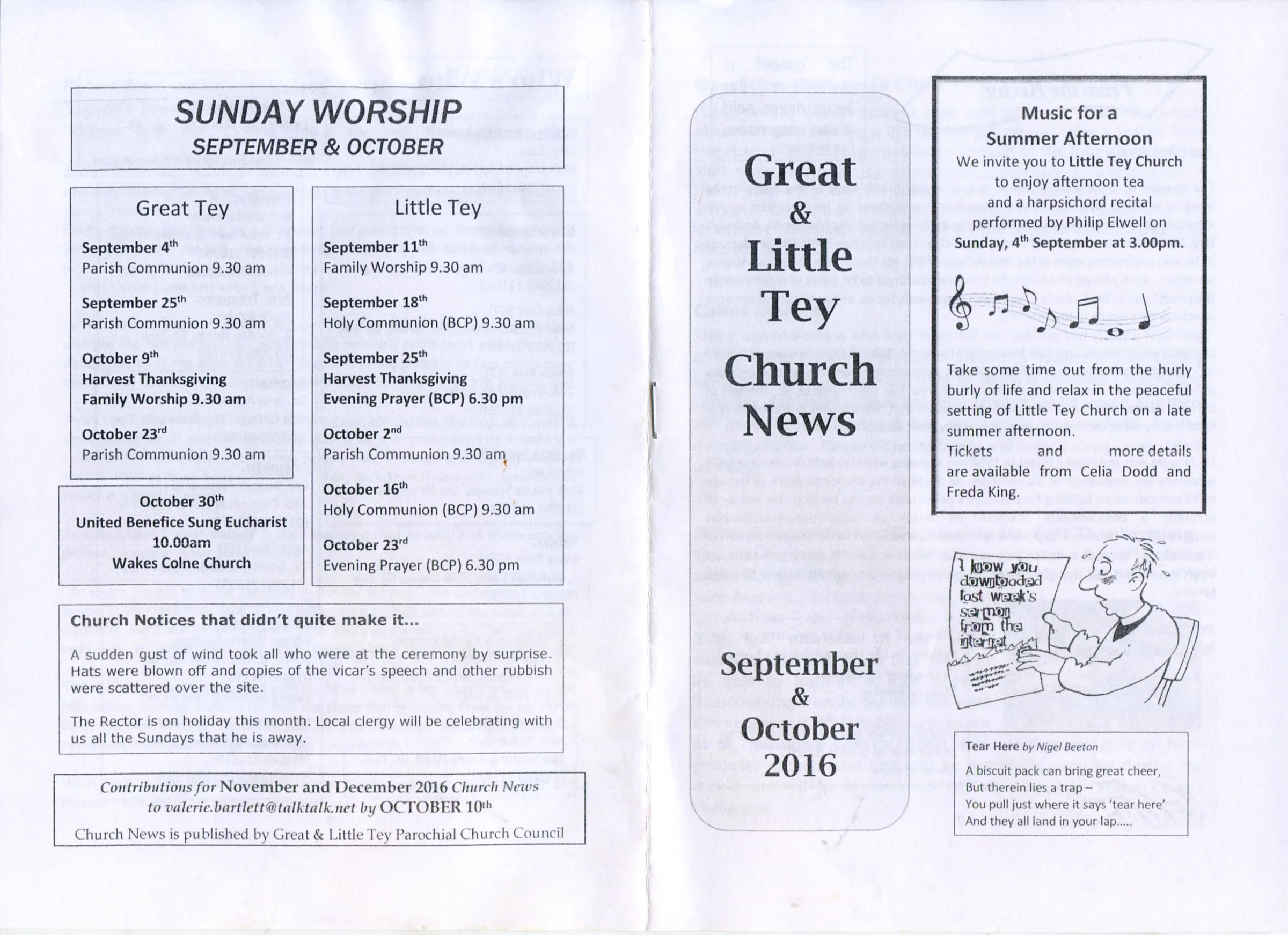 Selected pages from the Parish Magazine of Great Tey and Little Tey, September and October 2016.