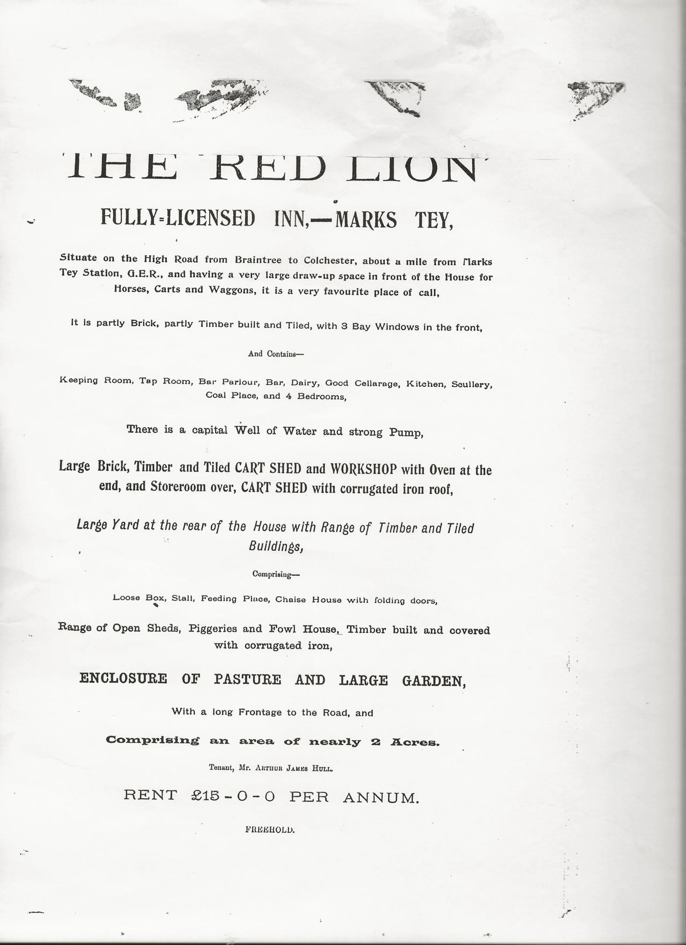 A Edwardian notice with a description of the The Red Lion. It was for the sale by auction on 30 May 1905 at The Red Lion in Colchester.