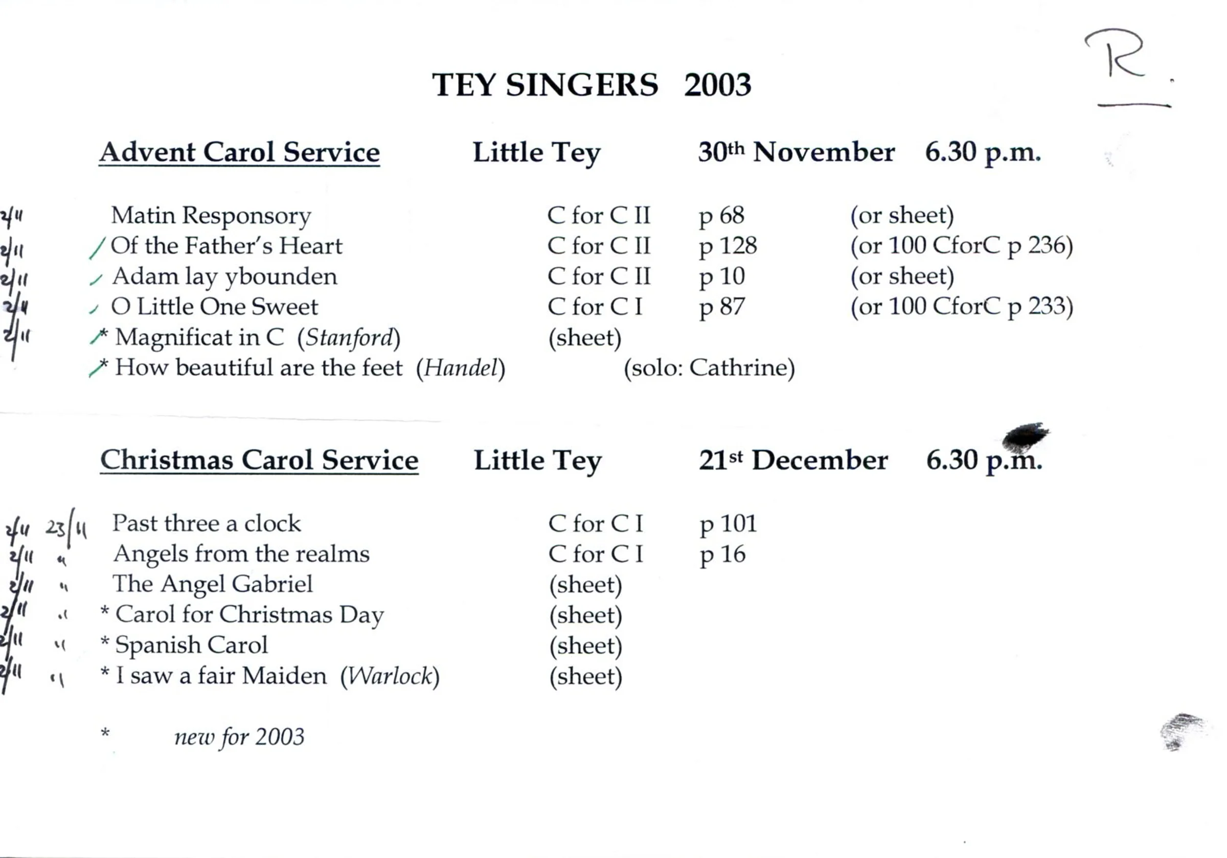 A list of music to be sung at the Advent and Christmas carols services at Little Tey church in 2003.