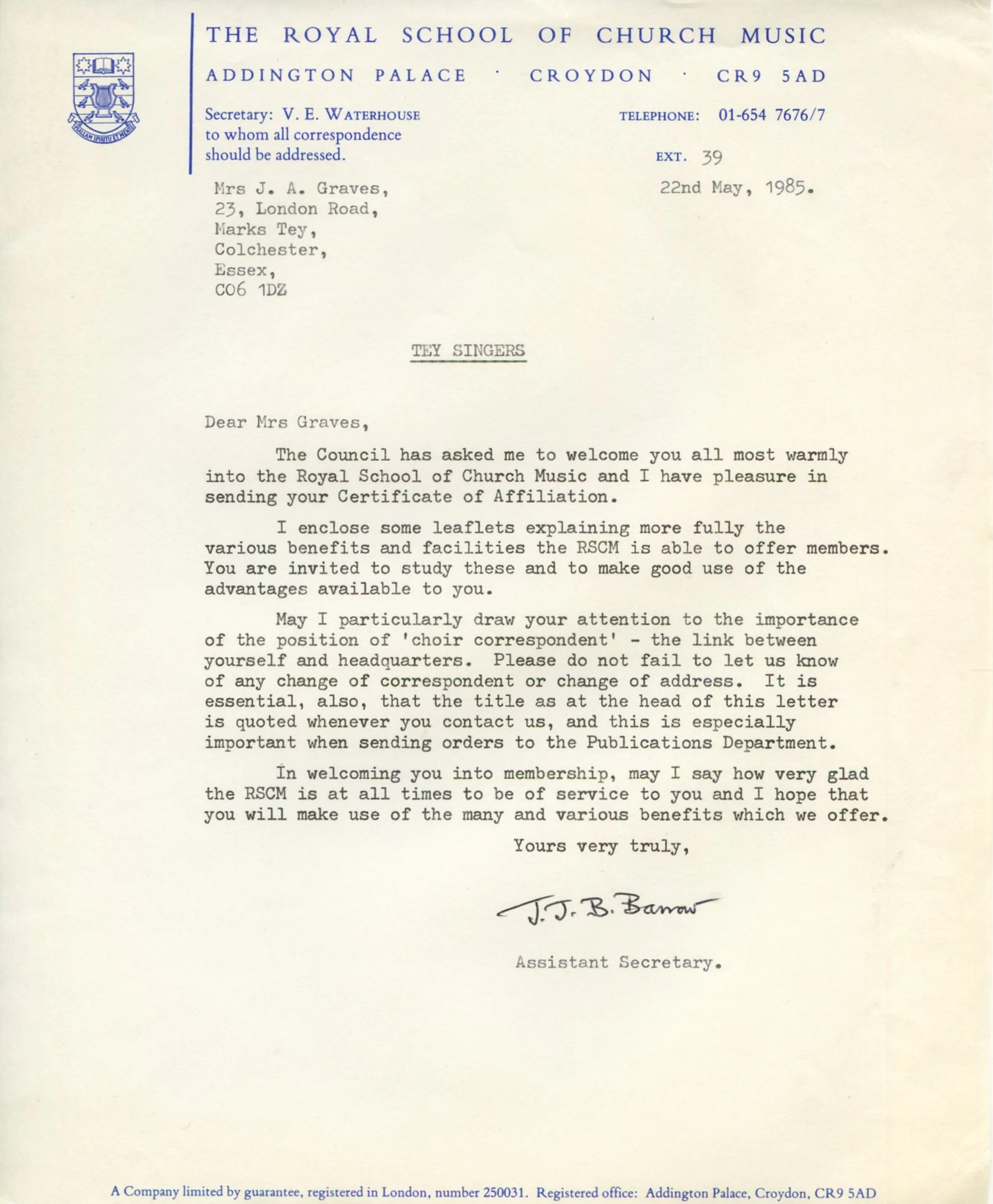 A letter from the Assistant Secretary of the Royal School of Church Music to Mrs J A Graves (Rosemary Graves) about the Affiliation of The Tey Singers. The letter is dated 22 March 1985.