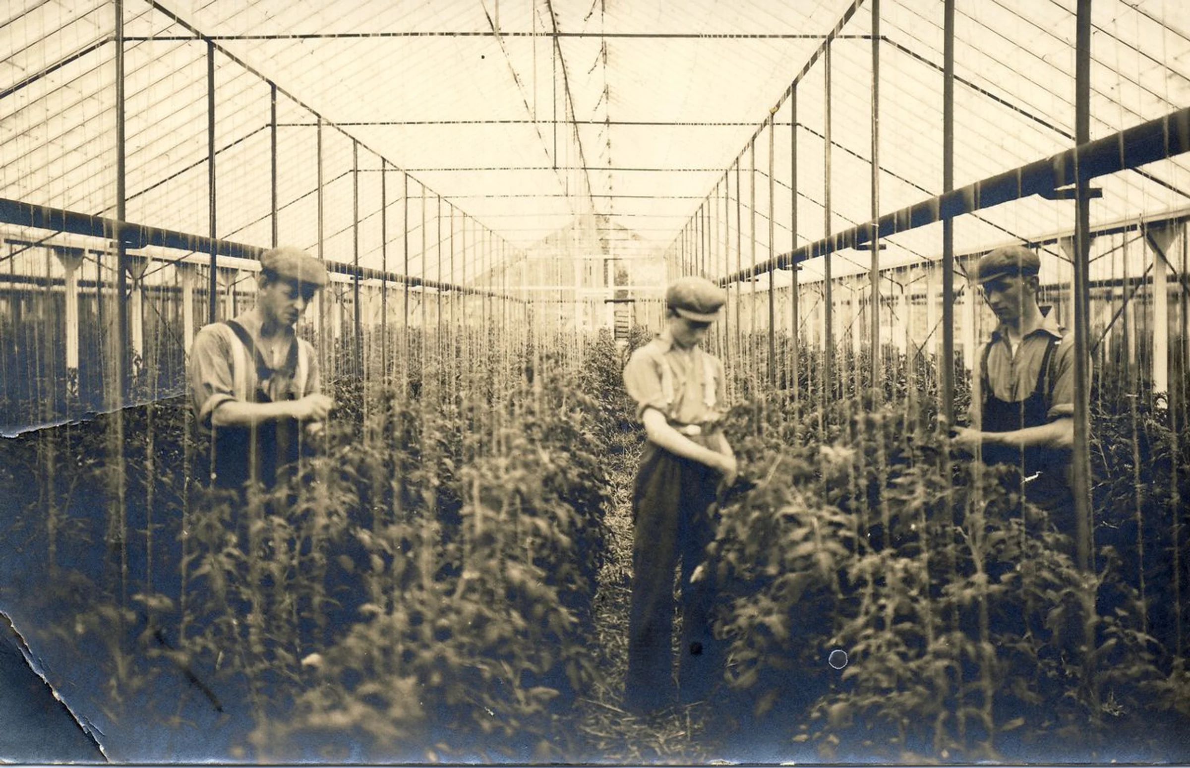 Three men working in a greenhouse at Tey Gardens