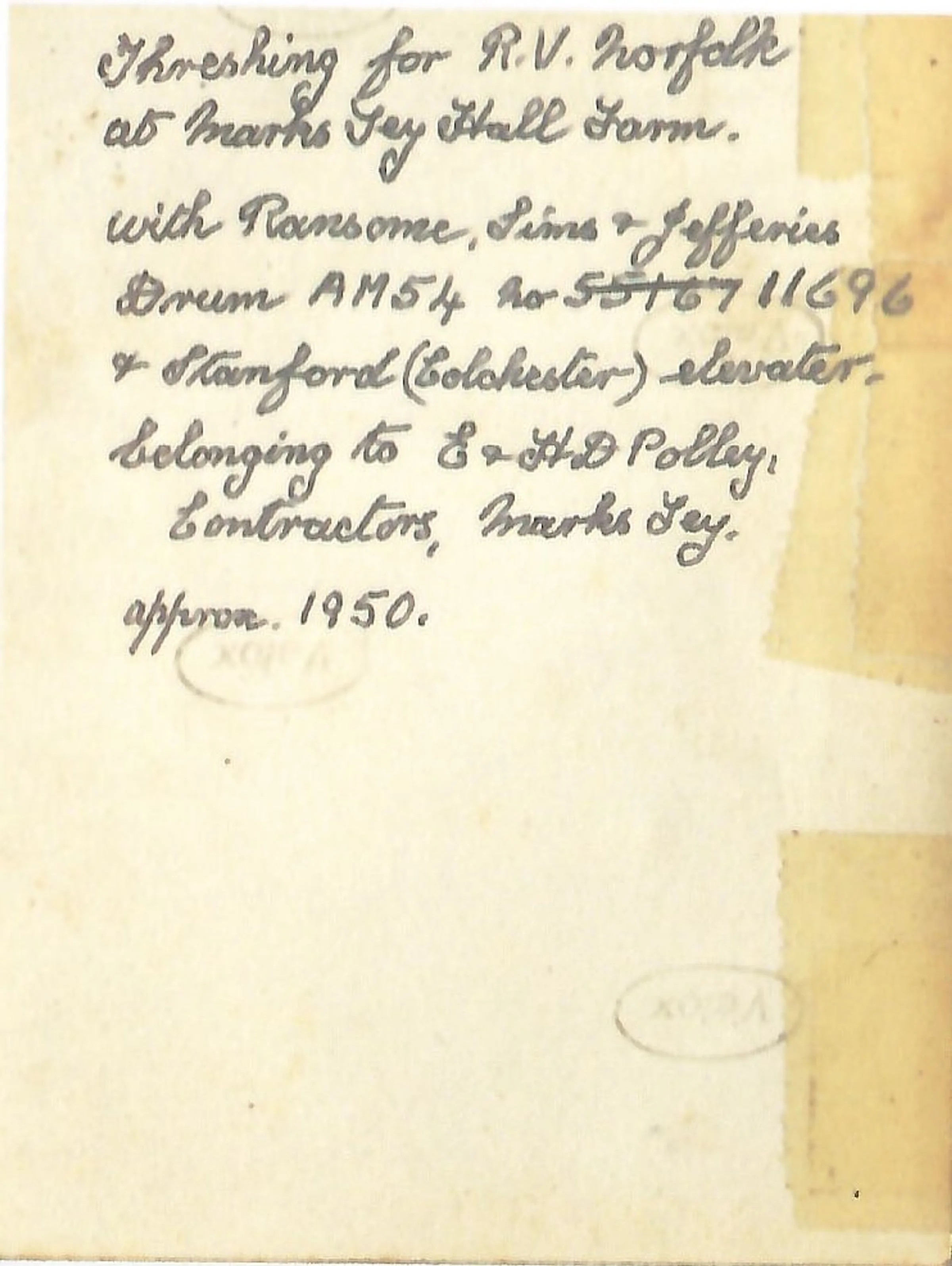 Threshing for R V Norfolk at Marks Tey Hall Farm (assuming this reverse is for that photo). About 1950.