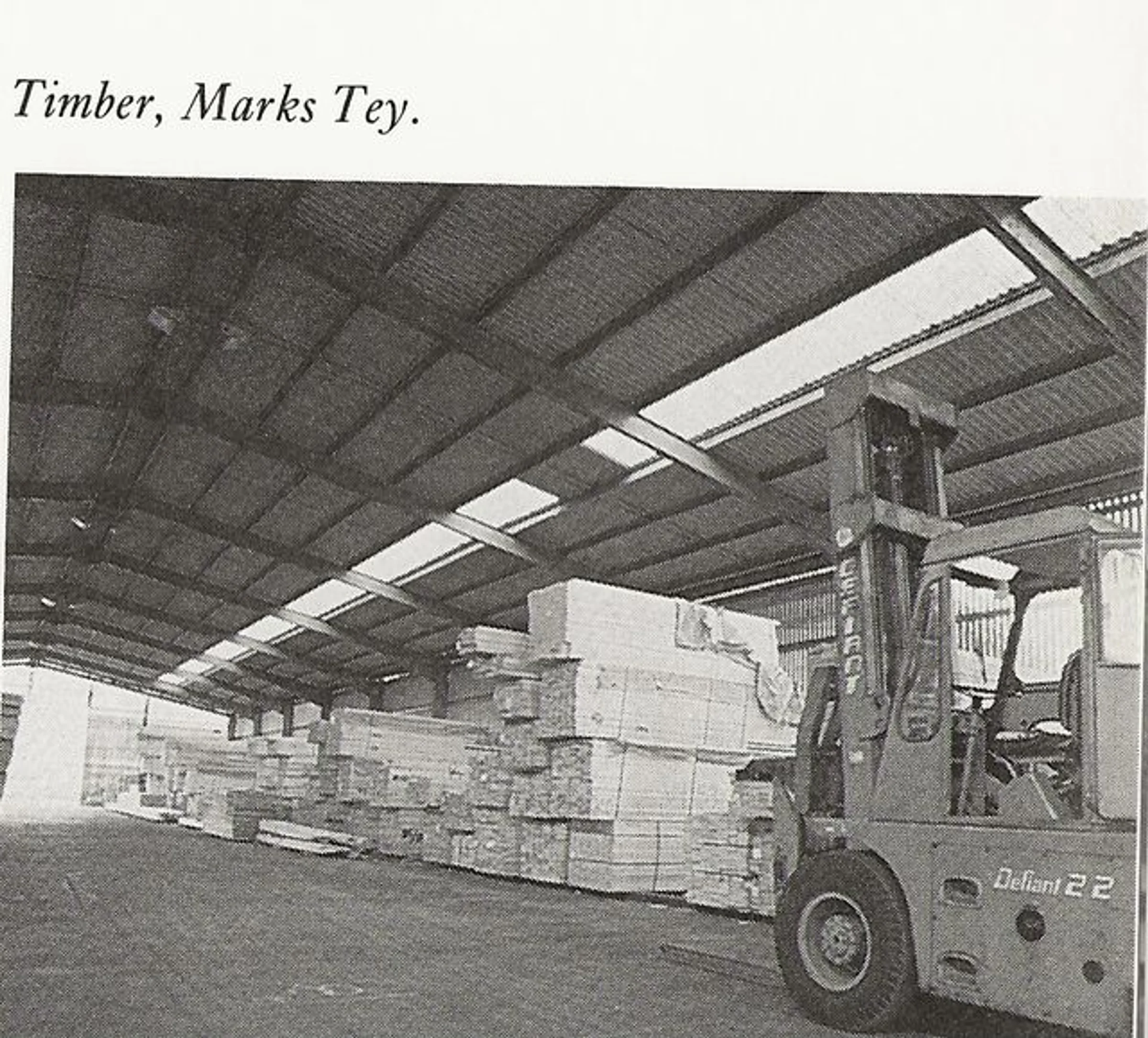 A warehouse at Andersons containing timber and a fork lift truck on the right.