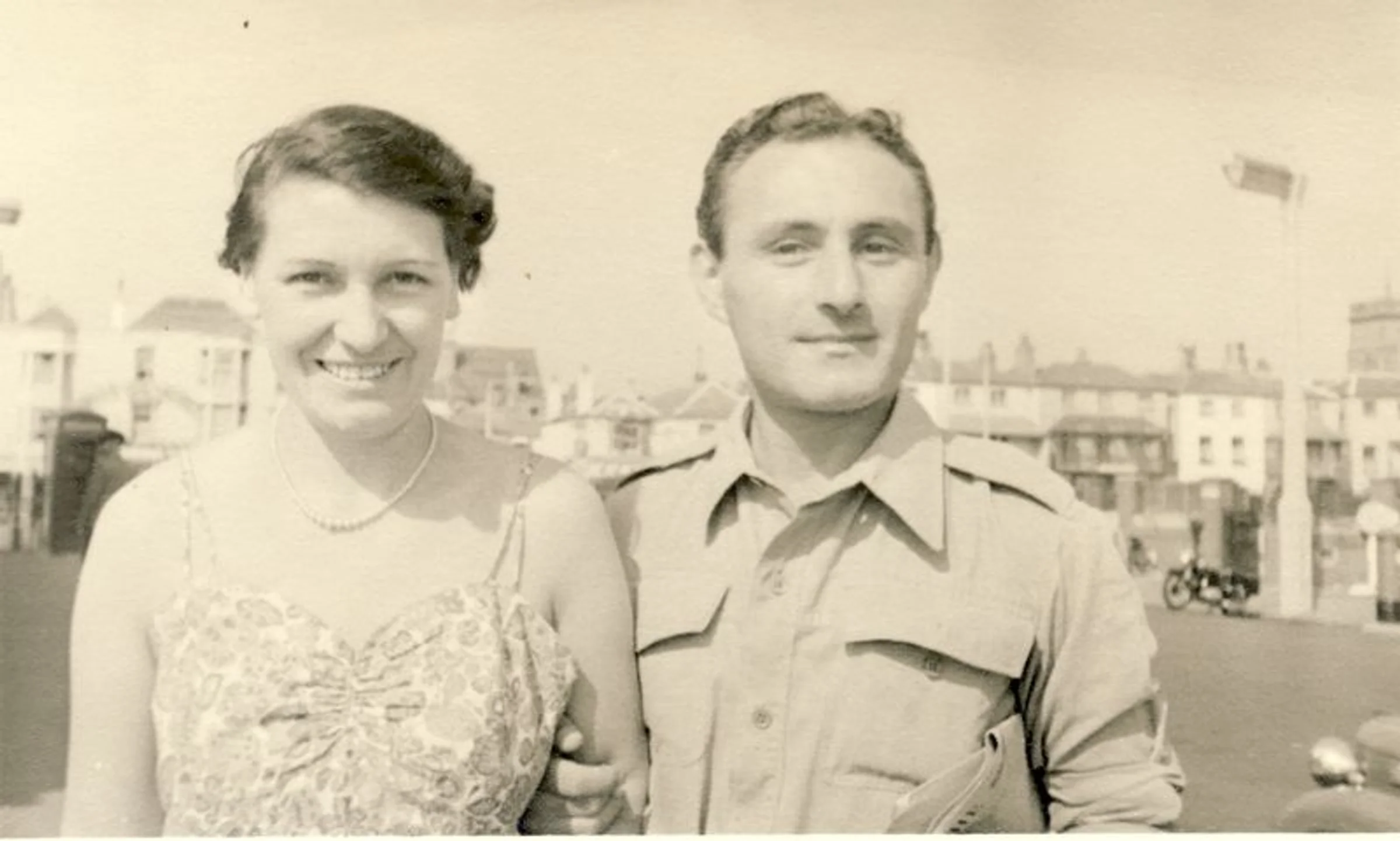 Unlabelled photo of a couple, arm in arm. They are not in Marks Tey. The photo could have been taken in a seaside town in summer weather. The man is likely to be Dennis Todd and the lady his wife Emily E (nee Ayers).