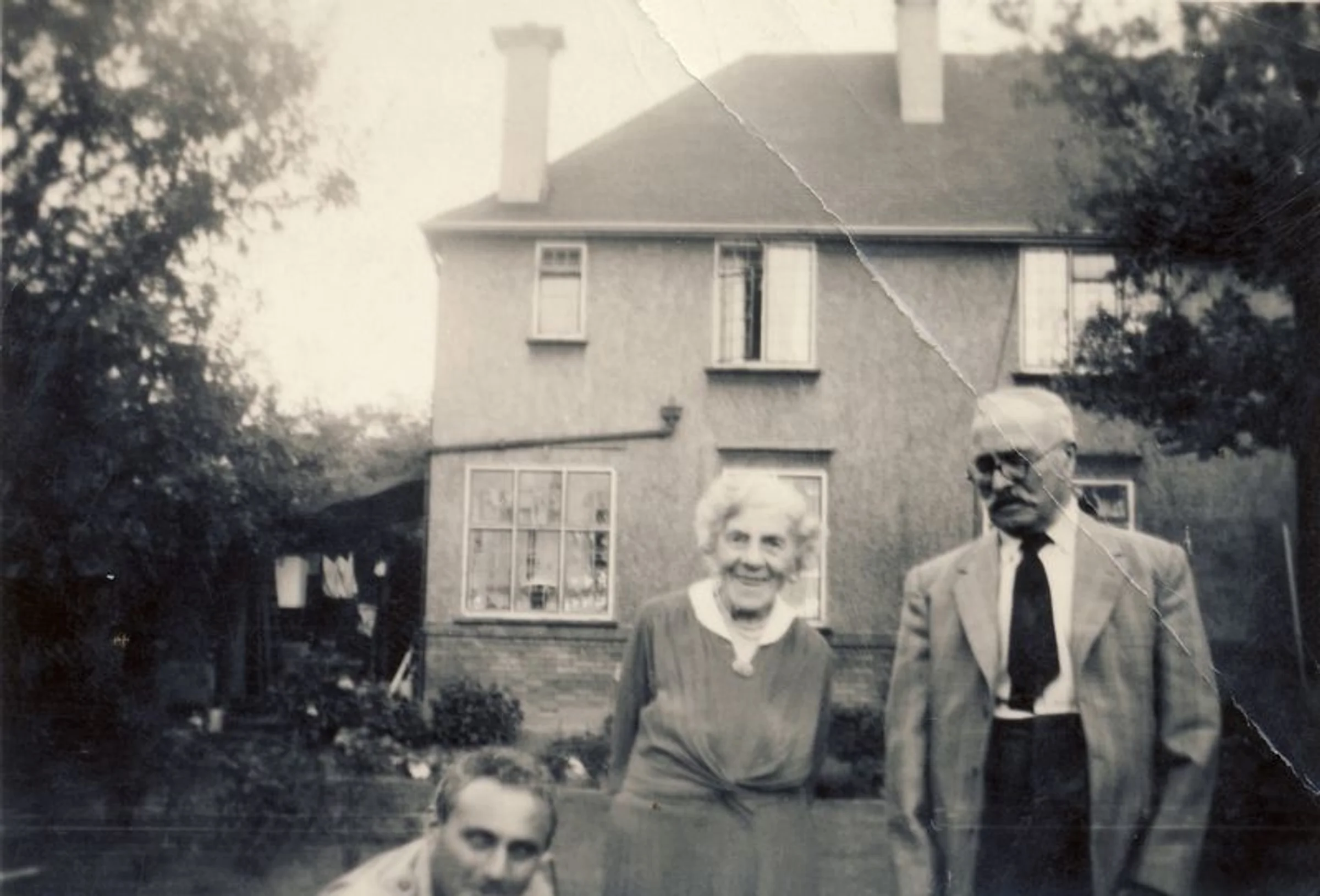 The photo is labelled Walter Todd who must be the man wearing a tie. With him are an older lady (maybe his mother) and a person crouching down. It is likely that Walter is standing outside his home in Marks Tey.
