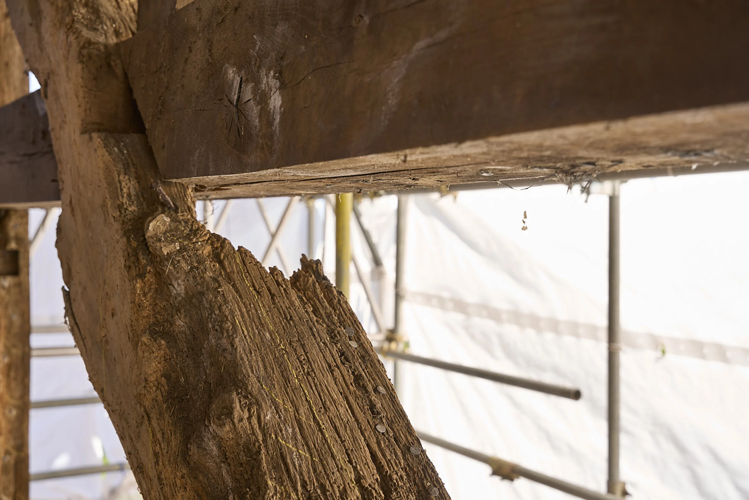 Photograph of the work-in-progress refurbishment of St Andrew’s Church tower, in 2025 as part of the National Lottery Heritage Funded project.