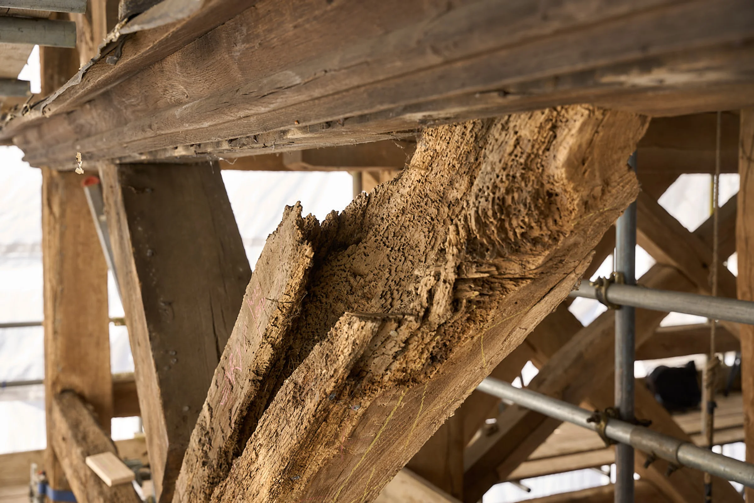Photograph of the work-in-progress refurbishment of St Andrew’s Church tower, in 2025 as part of the National Lottery Heritage Funded project.