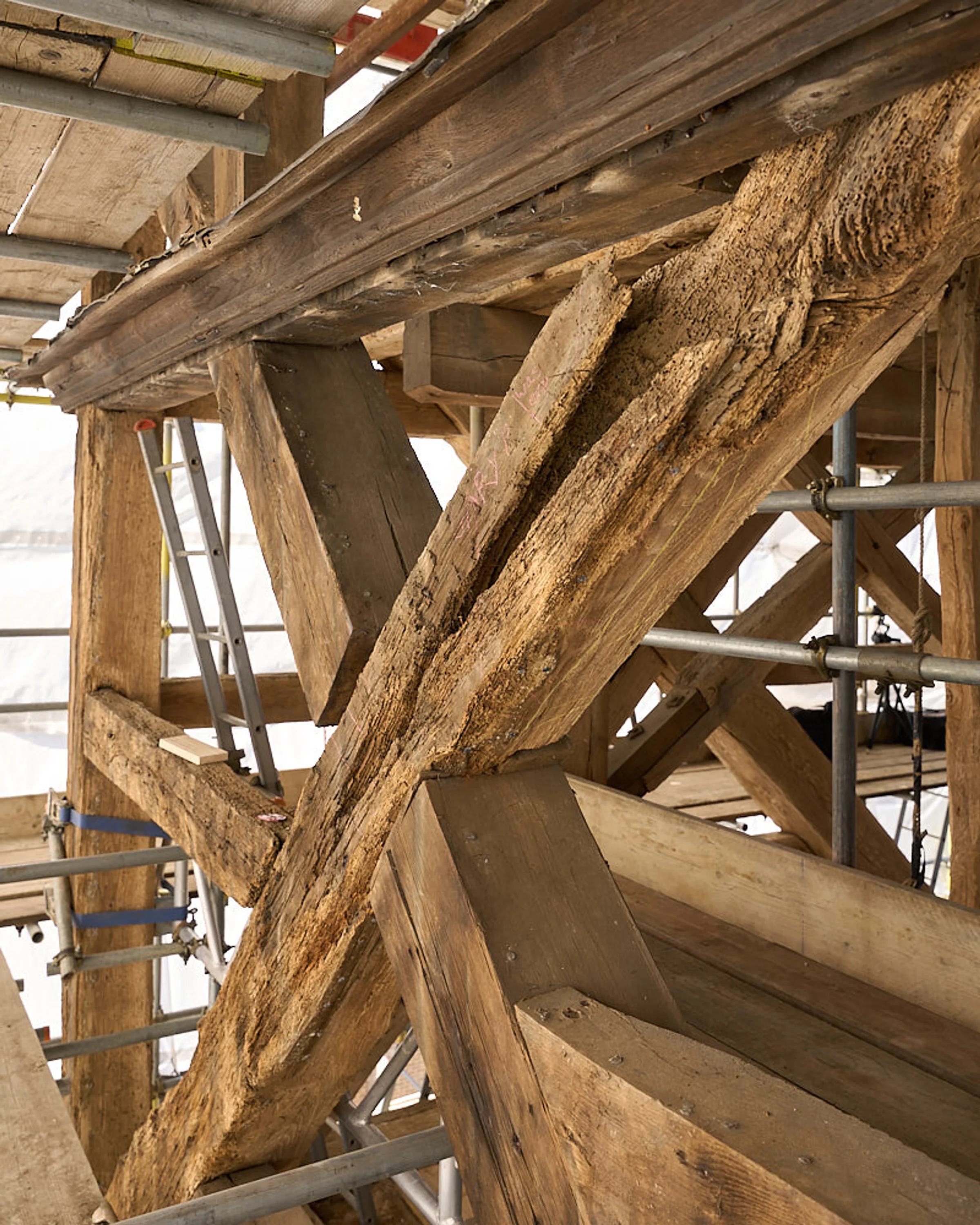Photograph of the work-in-progress refurbishment of St Andrew’s Church tower, in 2025 as part of the National Lottery Heritage Funded project.