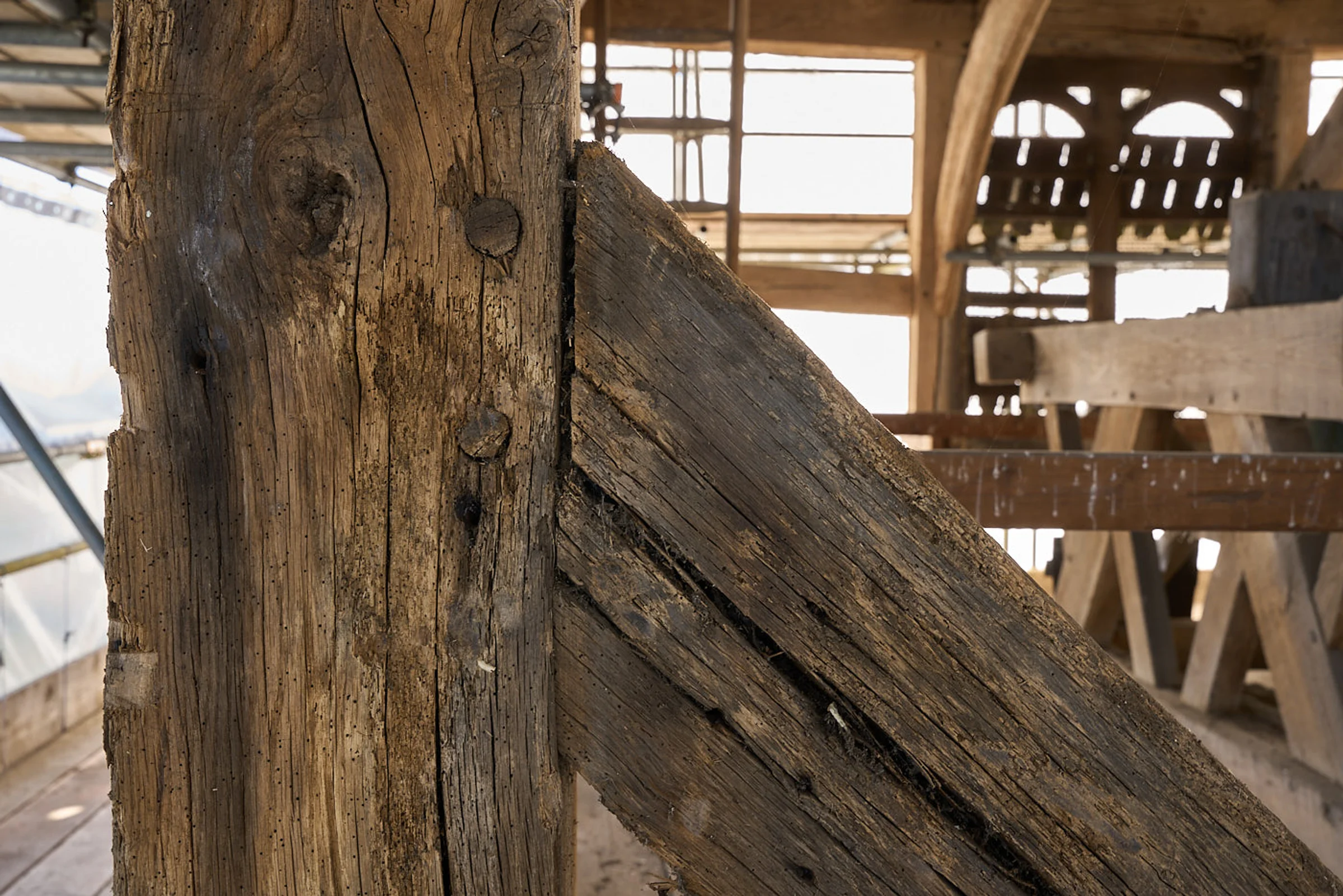 Photograph of the work-in-progress refurbishment of St Andrew’s Church tower, in 2025 as part of the National Lottery Heritage Funded project.