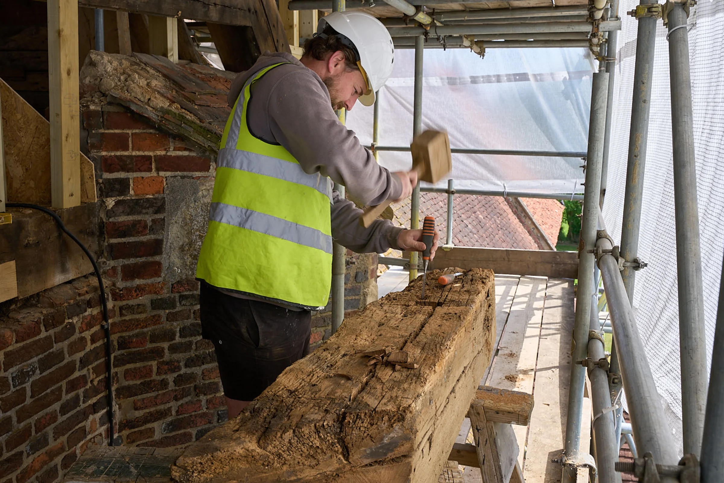 Photograph of the work-in-progress refurbishment of St Andrew’s Church tower, in 2025 as part of the National Lottery Heritage Funded project.