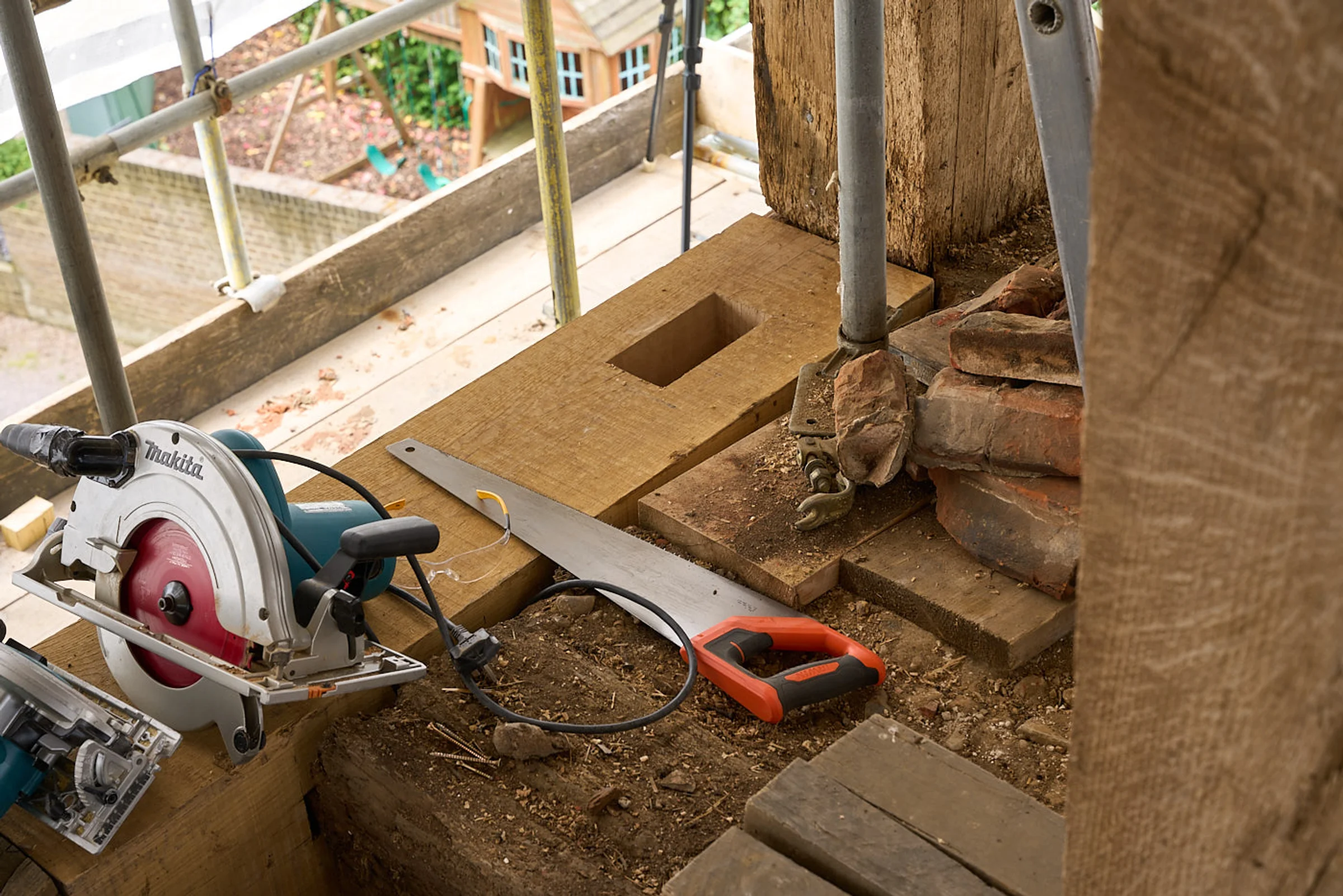 Photograph of the work-in-progress refurbishment of St Andrew’s Church tower, in 2025 as part of the National Lottery Heritage Funded project.