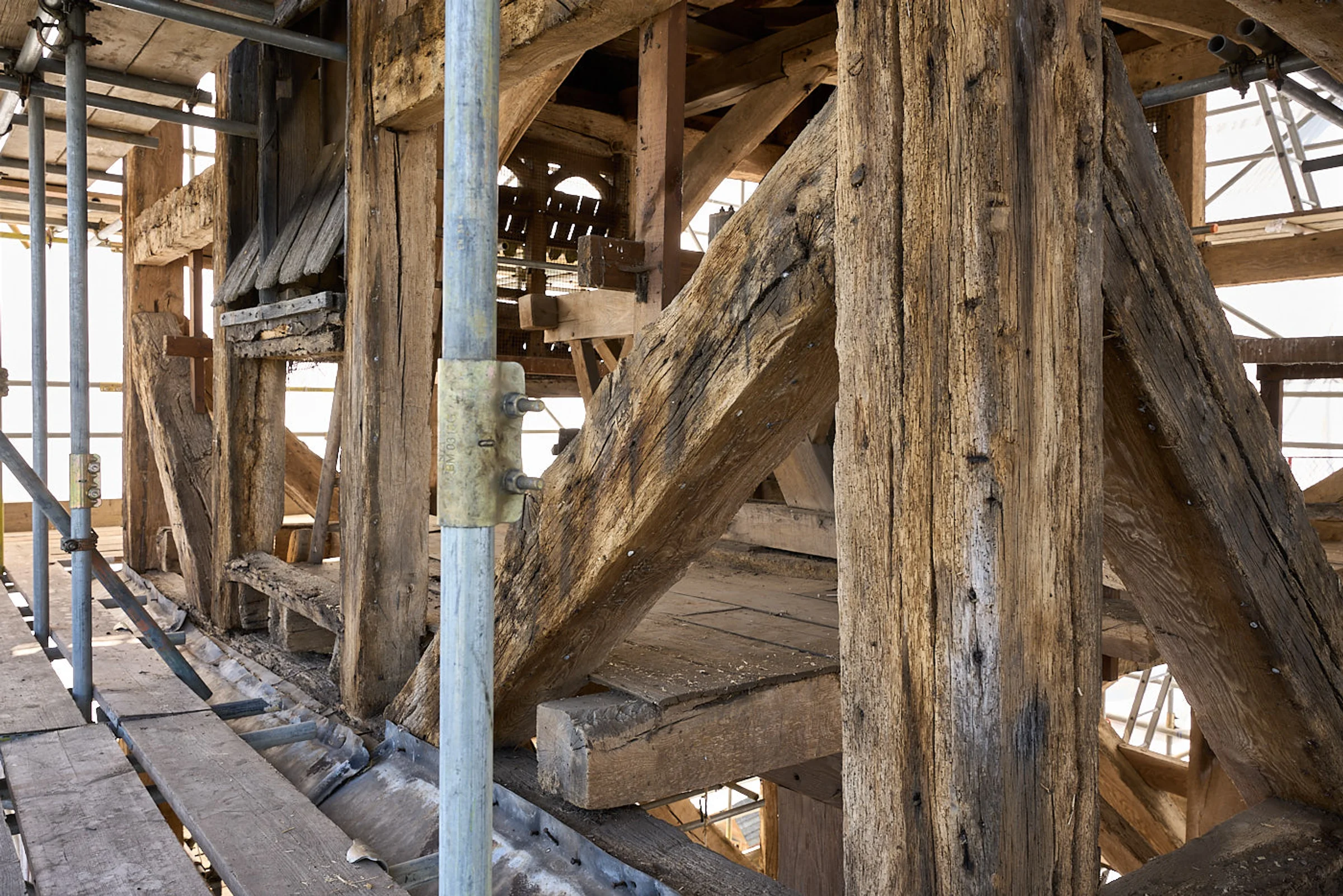 Photograph of the work-in-progress refurbishment of St Andrew’s Church tower, in 2025 as part of the National Lottery Heritage Funded project.