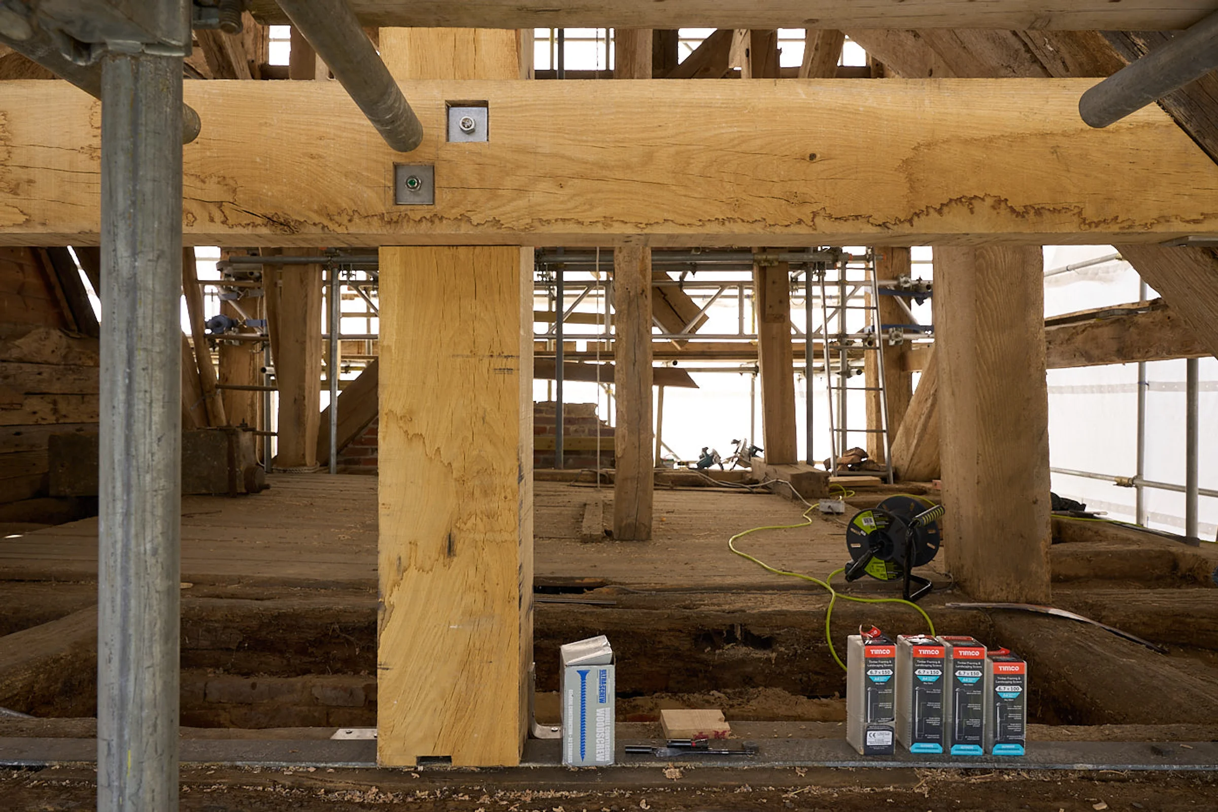 Photograph of the work-in-progress refurbishment of St Andrew’s Church tower, in 2025 as part of the National Lottery Heritage Funded project.