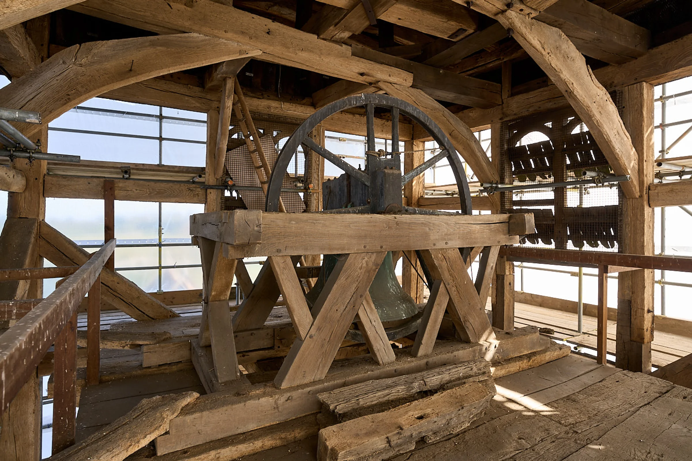 Photograph of the work-in-progress refurbishment of St Andrew’s Church tower, in 2025 as part of the National Lottery Heritage Funded project.