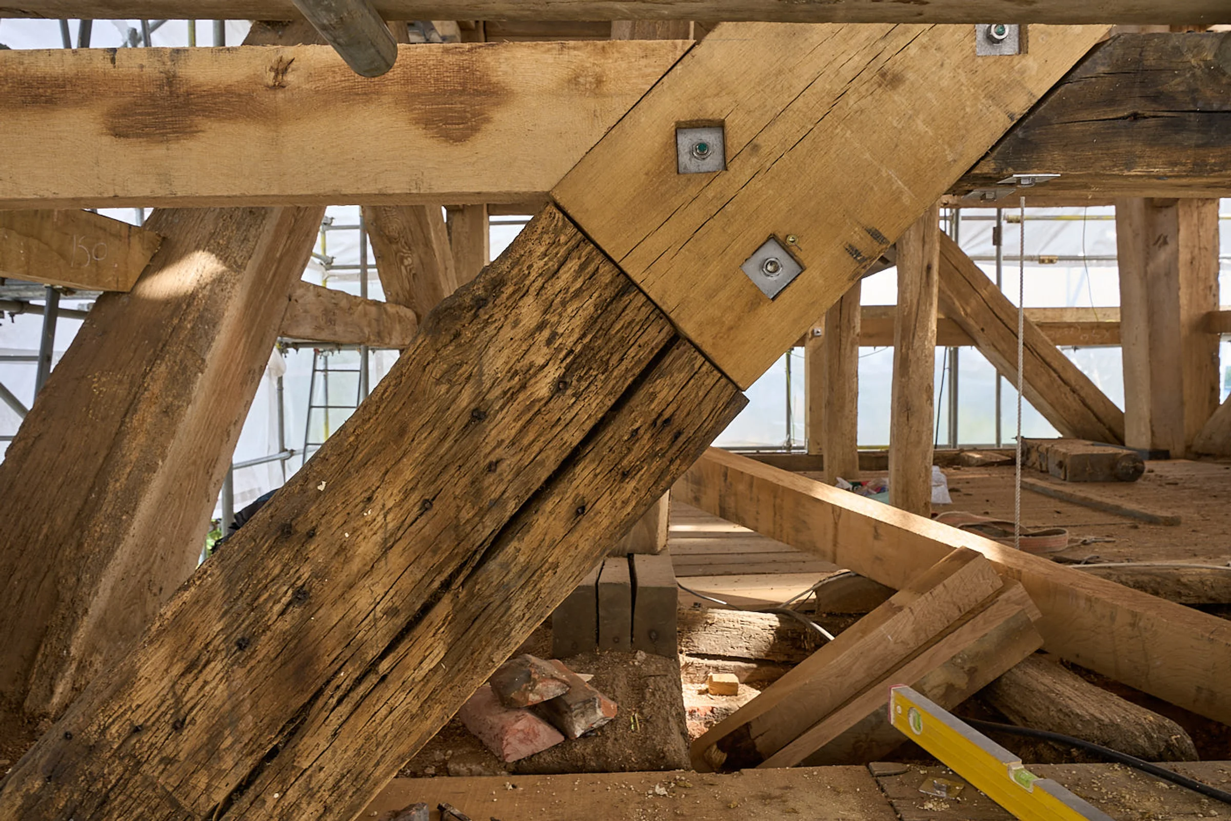 Photograph of the work-in-progress refurbishment of St Andrew’s Church tower, in 2025 as part of the National Lottery Heritage Funded project.