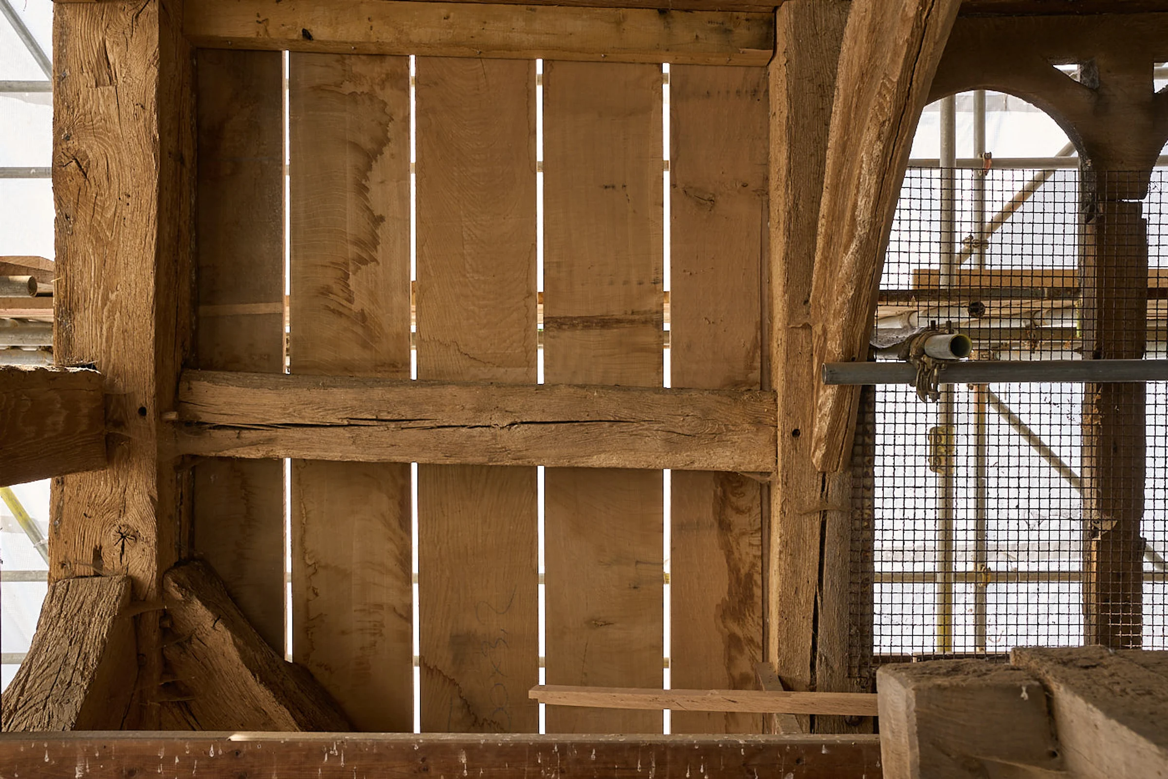 Photograph of the work-in-progress refurbishment of St Andrew’s Church tower, in 2025 as part of the National Lottery Heritage Funded project.