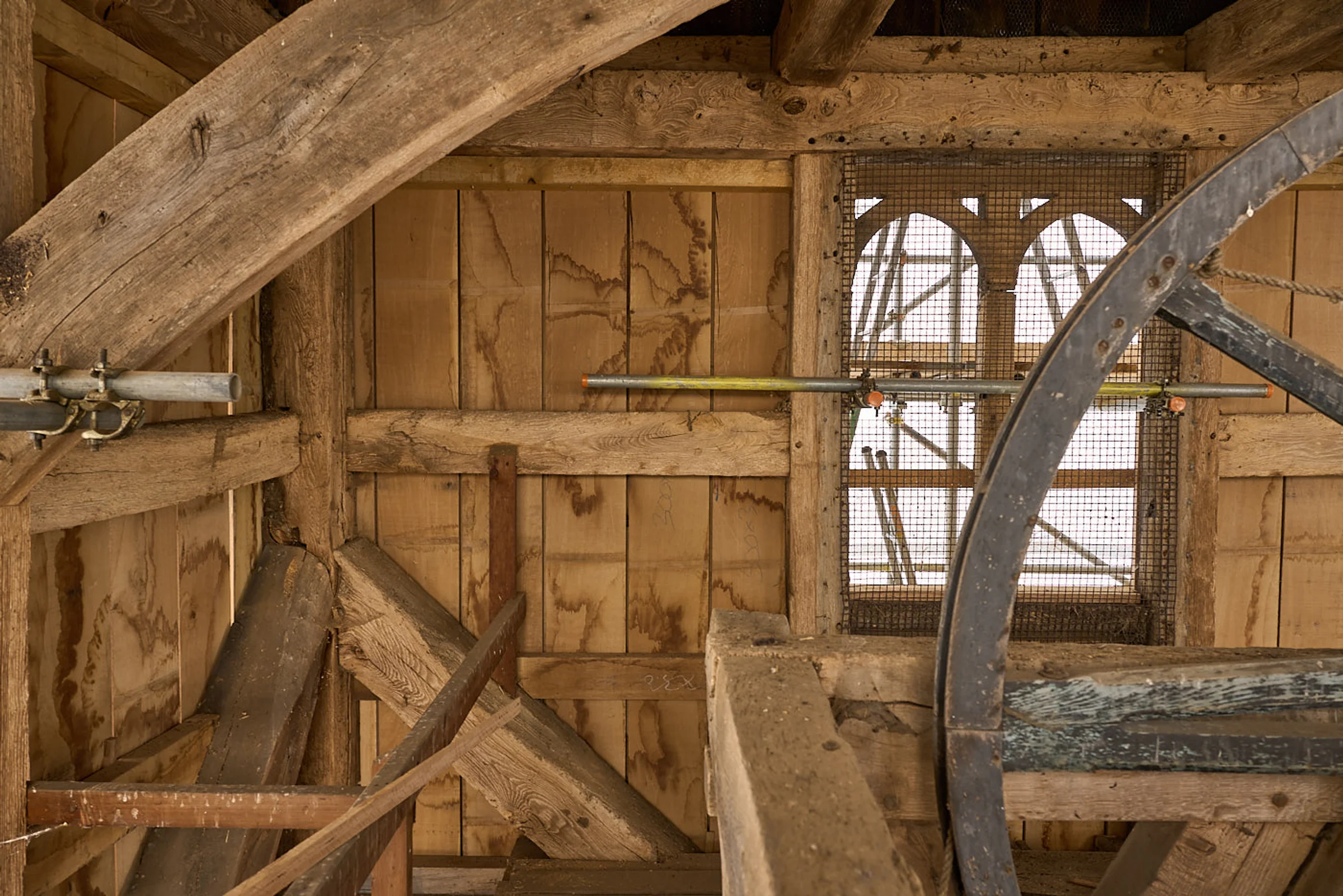 Photograph of the work-in-progress refurbishment of St Andrew’s Church tower, in 2025 as part of the National Lottery Heritage Funded project.