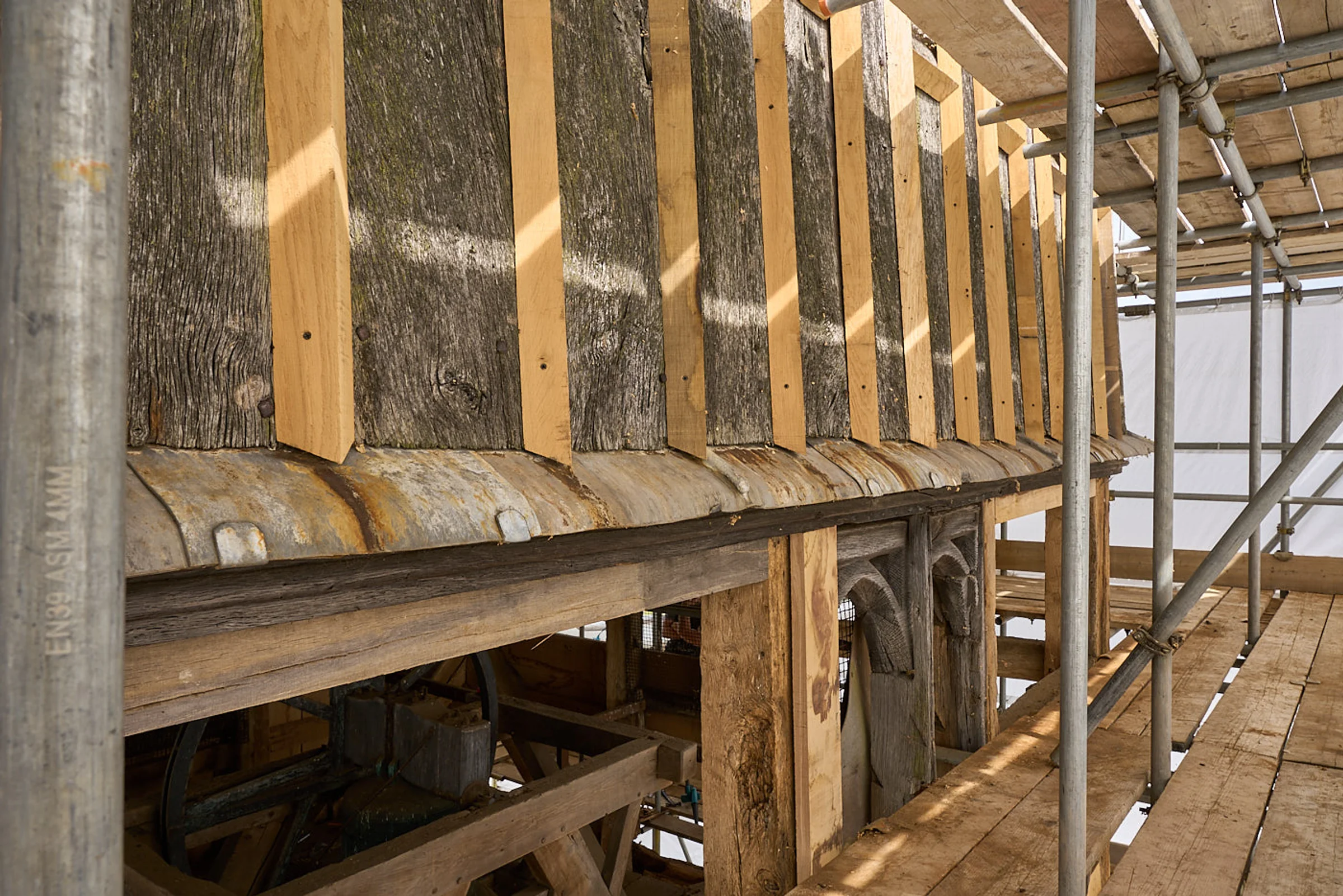 Photograph of the work-in-progress refurbishment of St Andrew’s Church tower, in 2025 as part of the National Lottery Heritage Funded project.