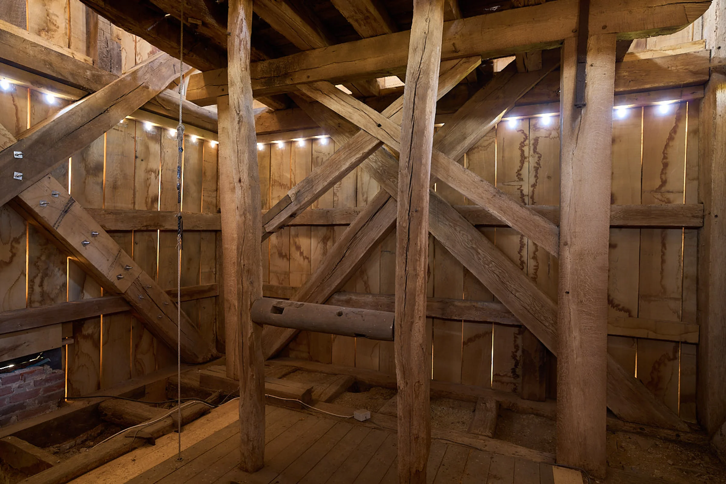 Photograph of the work-in-progress refurbishment of St Andrew’s Church tower, in 2025 as part of the National Lottery Heritage Funded project.