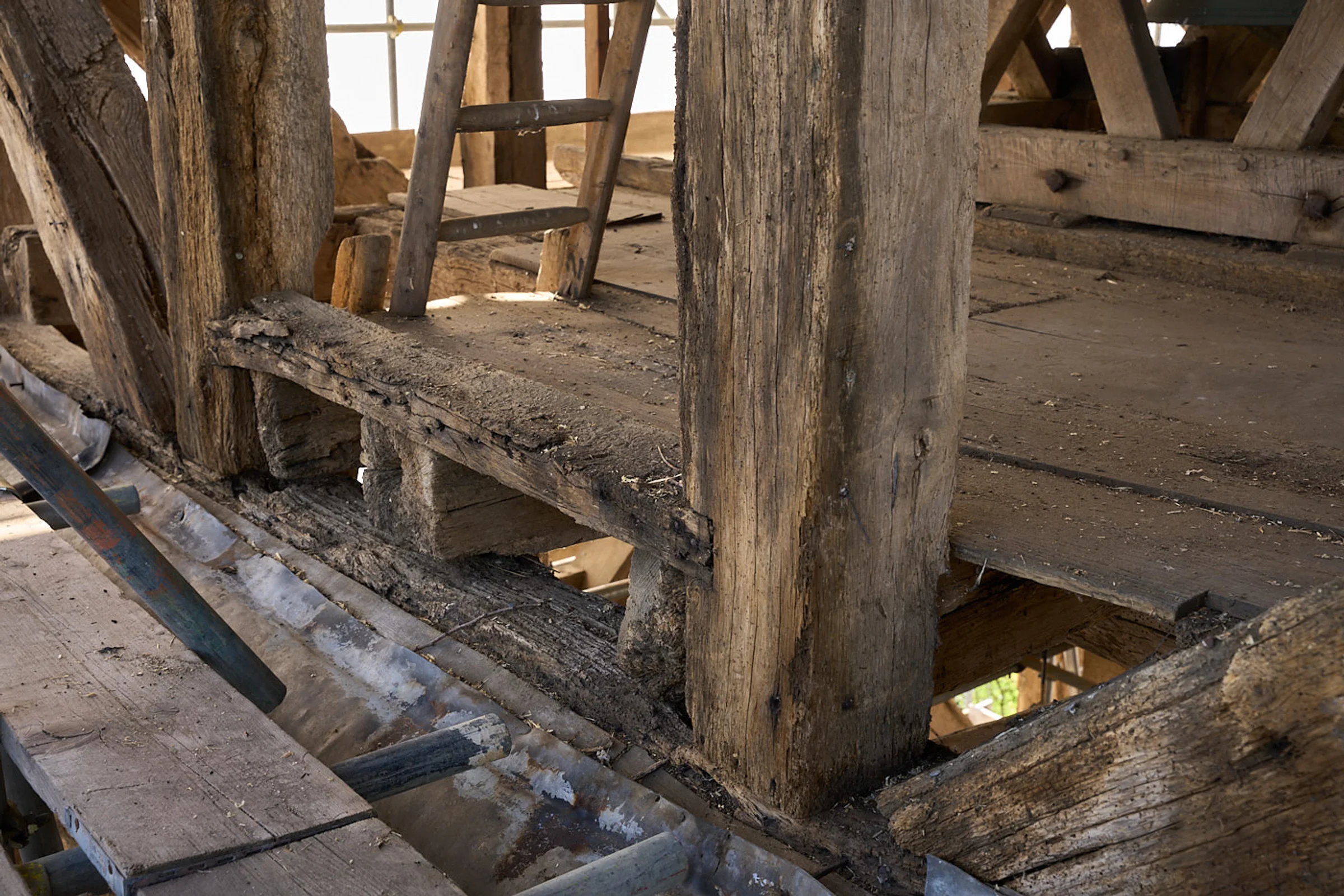 Photograph of the work-in-progress refurbishment of St Andrew’s Church tower, in 2025 as part of the National Lottery Heritage Funded project.