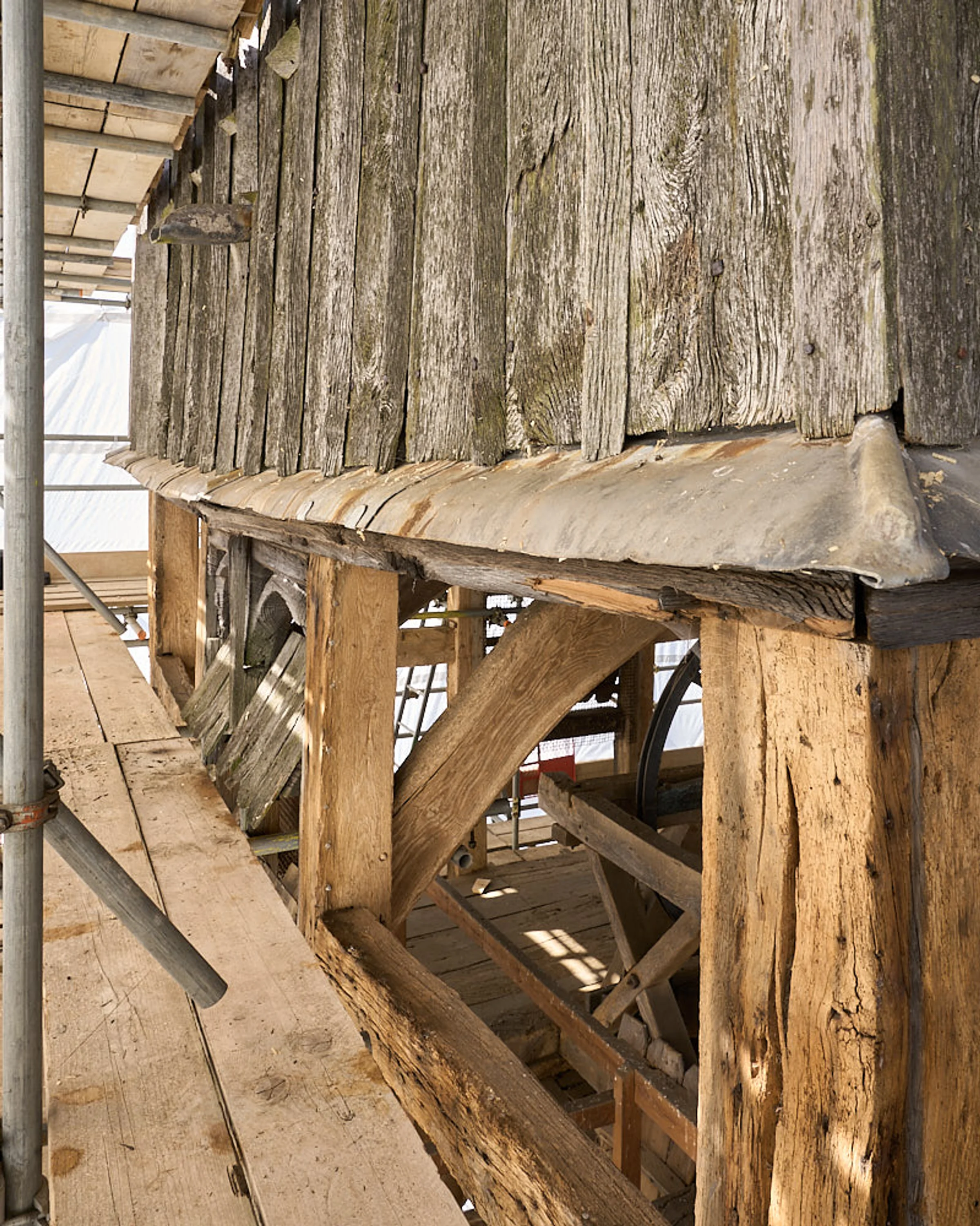 Photograph of the work-in-progress refurbishment of St Andrew’s Church tower, in 2025 as part of the National Lottery Heritage Funded project.