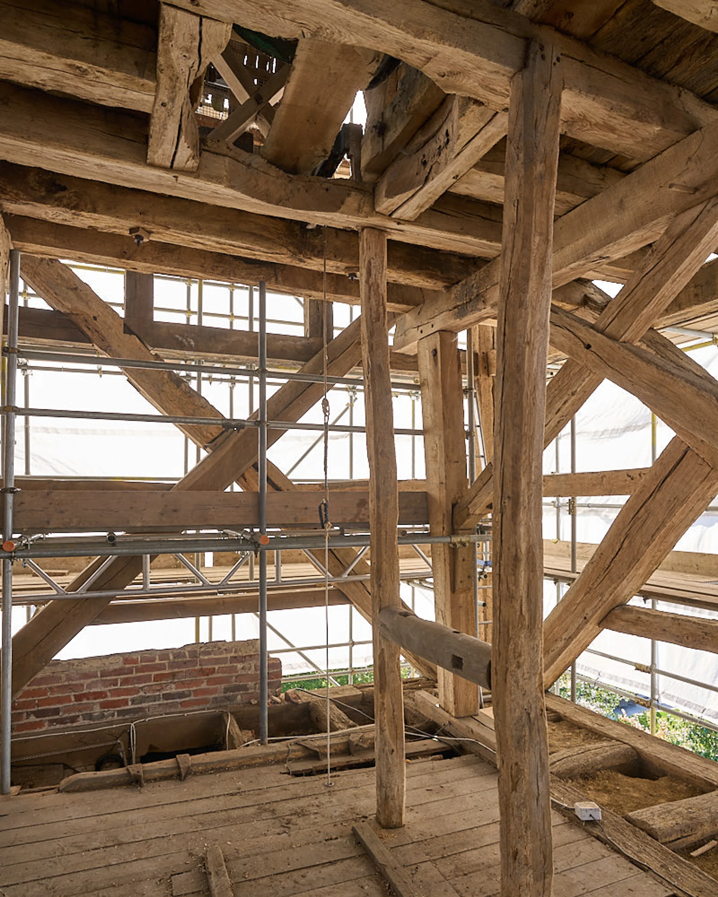 Photograph of the work-in-progress refurbishment of St Andrew’s Church tower, in 2025 as part of the National Lottery Heritage Funded project.