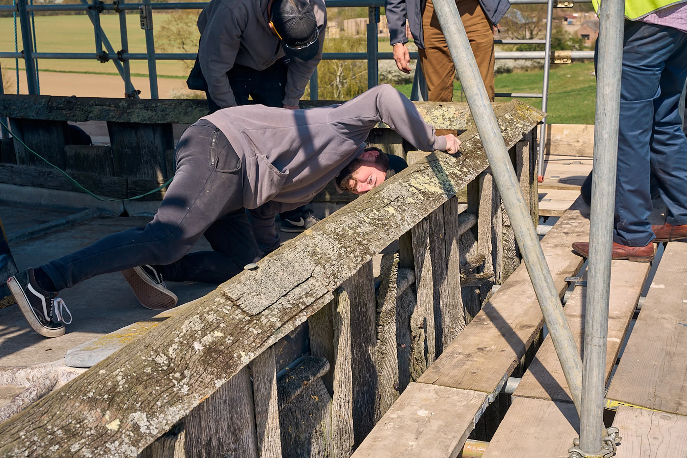 Photograph of the work-in-progress refurbishment of St Andrew’s Church tower, in 2025 as part of the National Lottery Heritage Funded project.