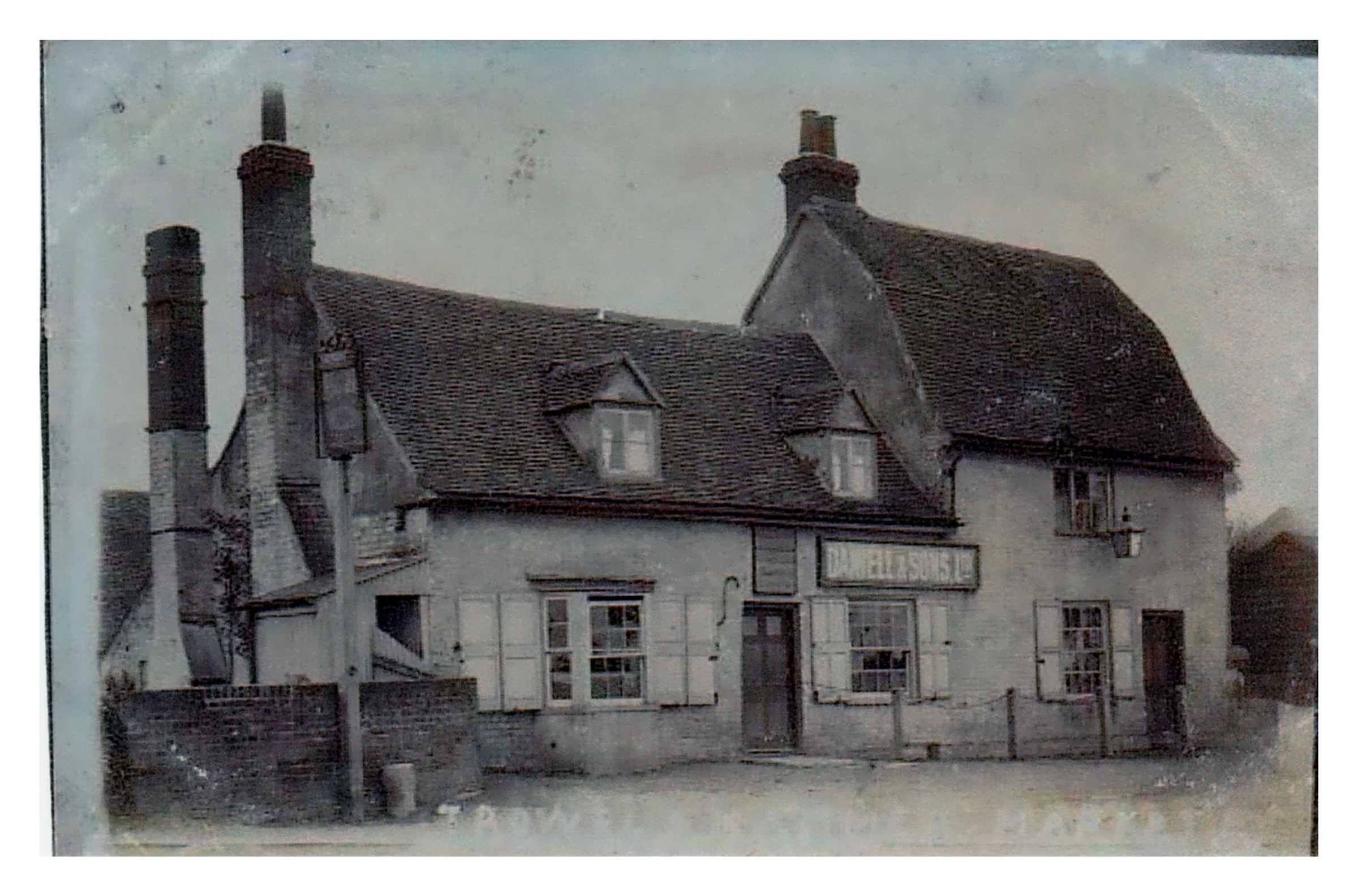 The Trowel and Hammer pub by the road to London. On this version of the image the wording above the door is legible and is Daniell & Sons Ltd, a local brewery.