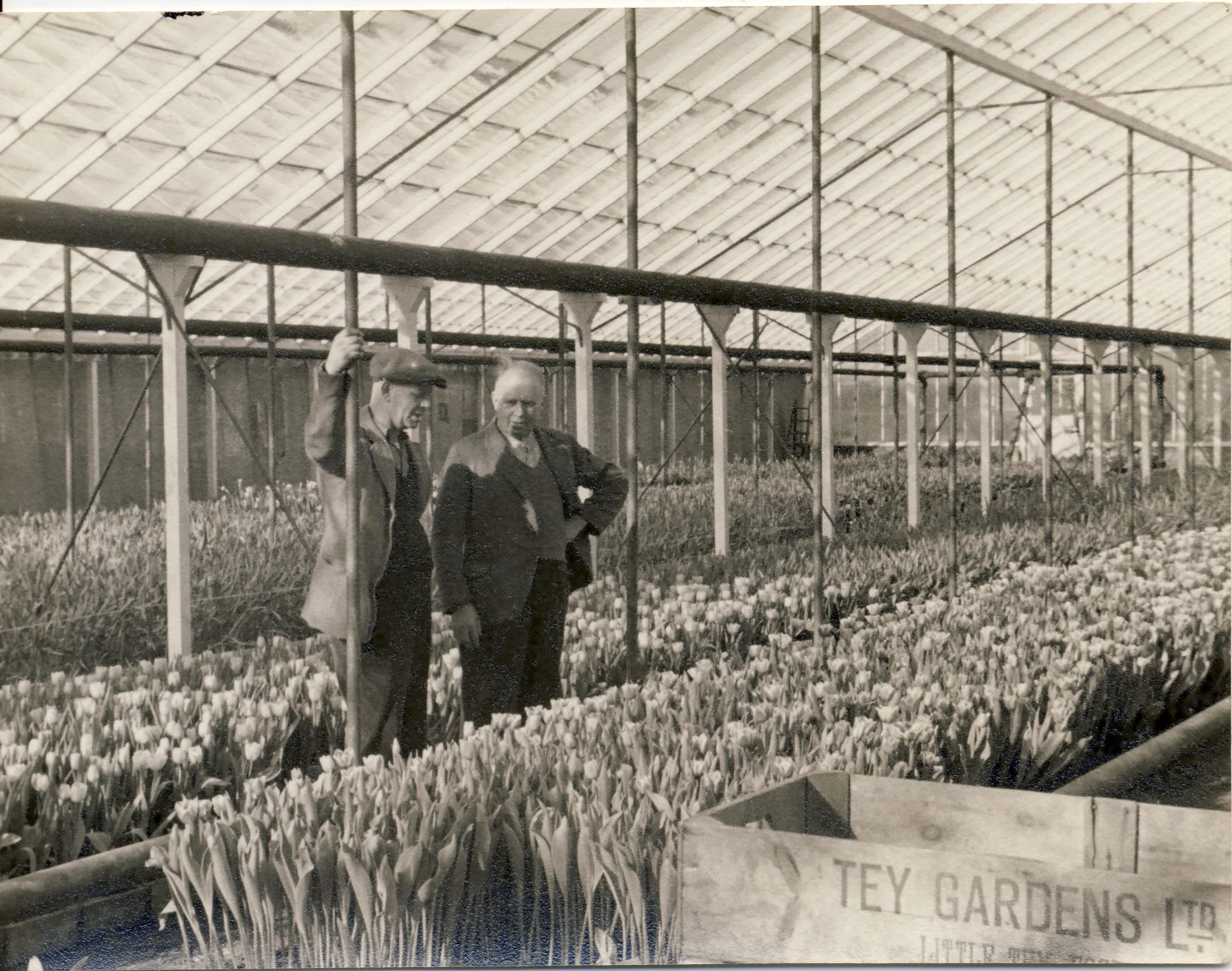Undated black & white photo of two older men in a greenhouse full of tulips. There is a sign that confirms that the place is Tey Gardens.