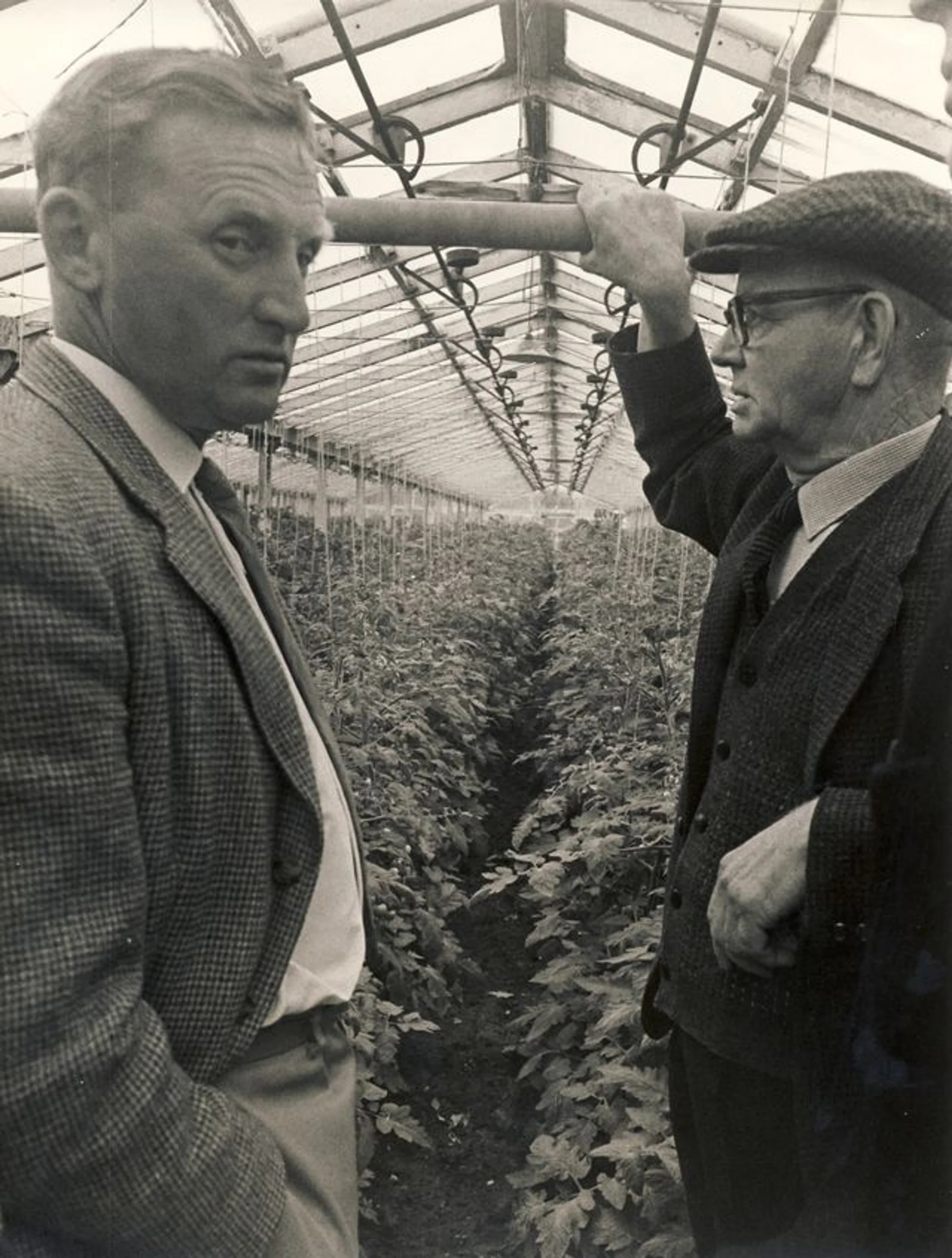 Two men in a greenhouse at Tey Gardens