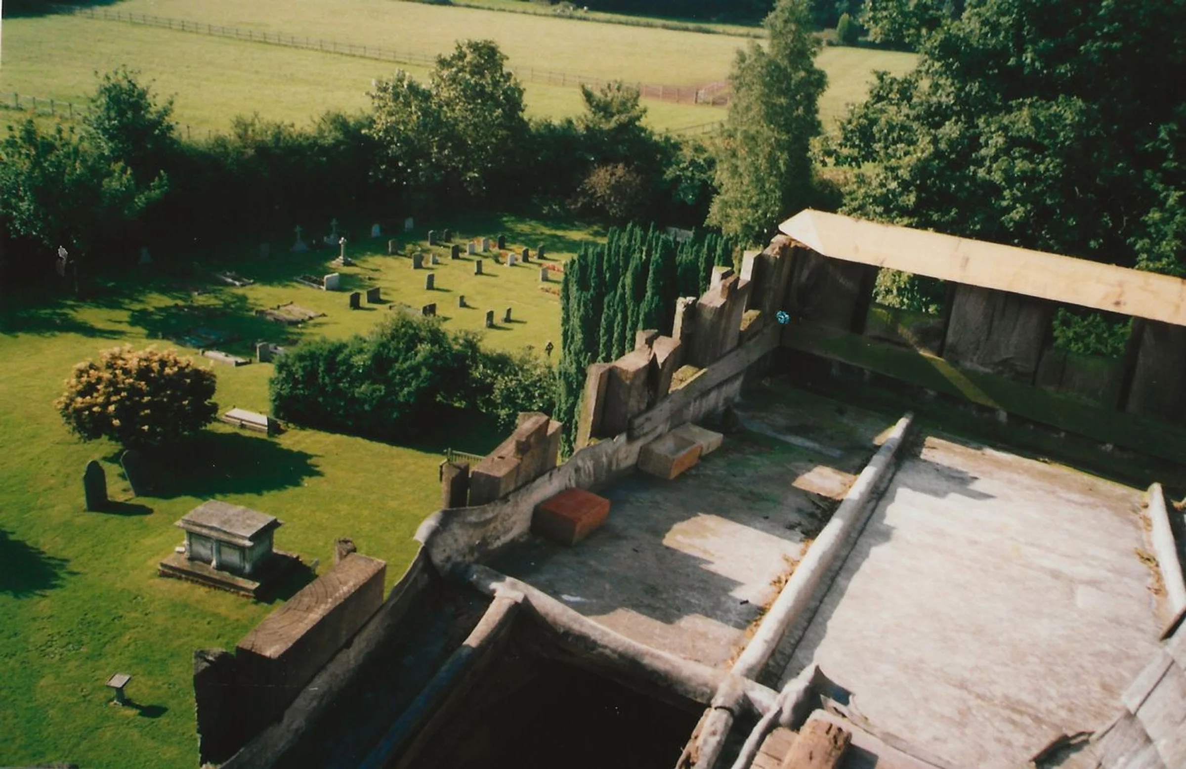 View from St Andrew's Church tower including the lead roof, looking across the churchyard