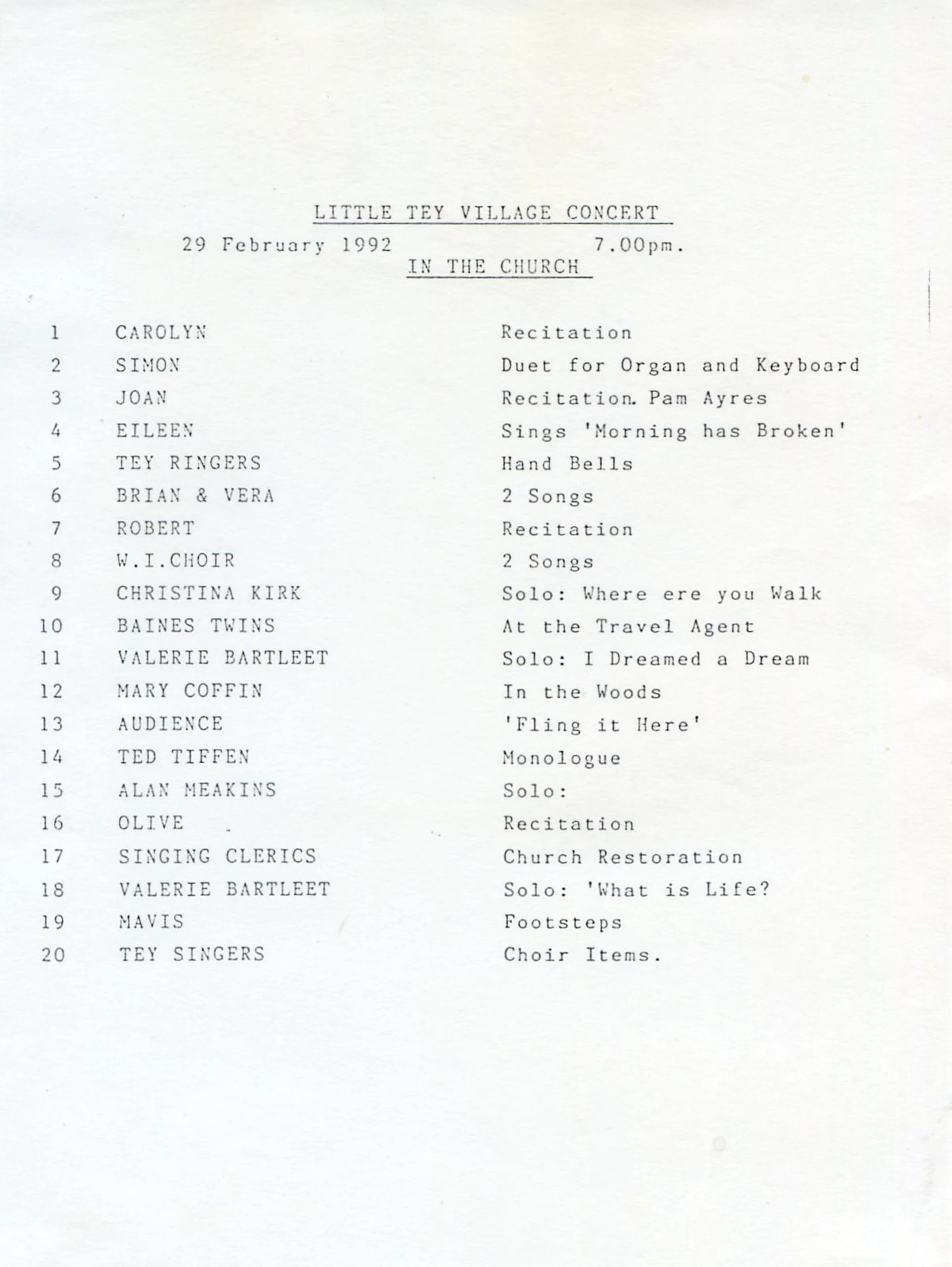 The programme of items in the Village Concert held in Little Tey church on 29 February 1992. Performers included residents, Rev Brian Snelling and wife Vera, the WI Choir, the Tey Ringers, The Tey Singers and the local 'Singing Clerics'. There were a variety of recitations, monologues and sung solos.