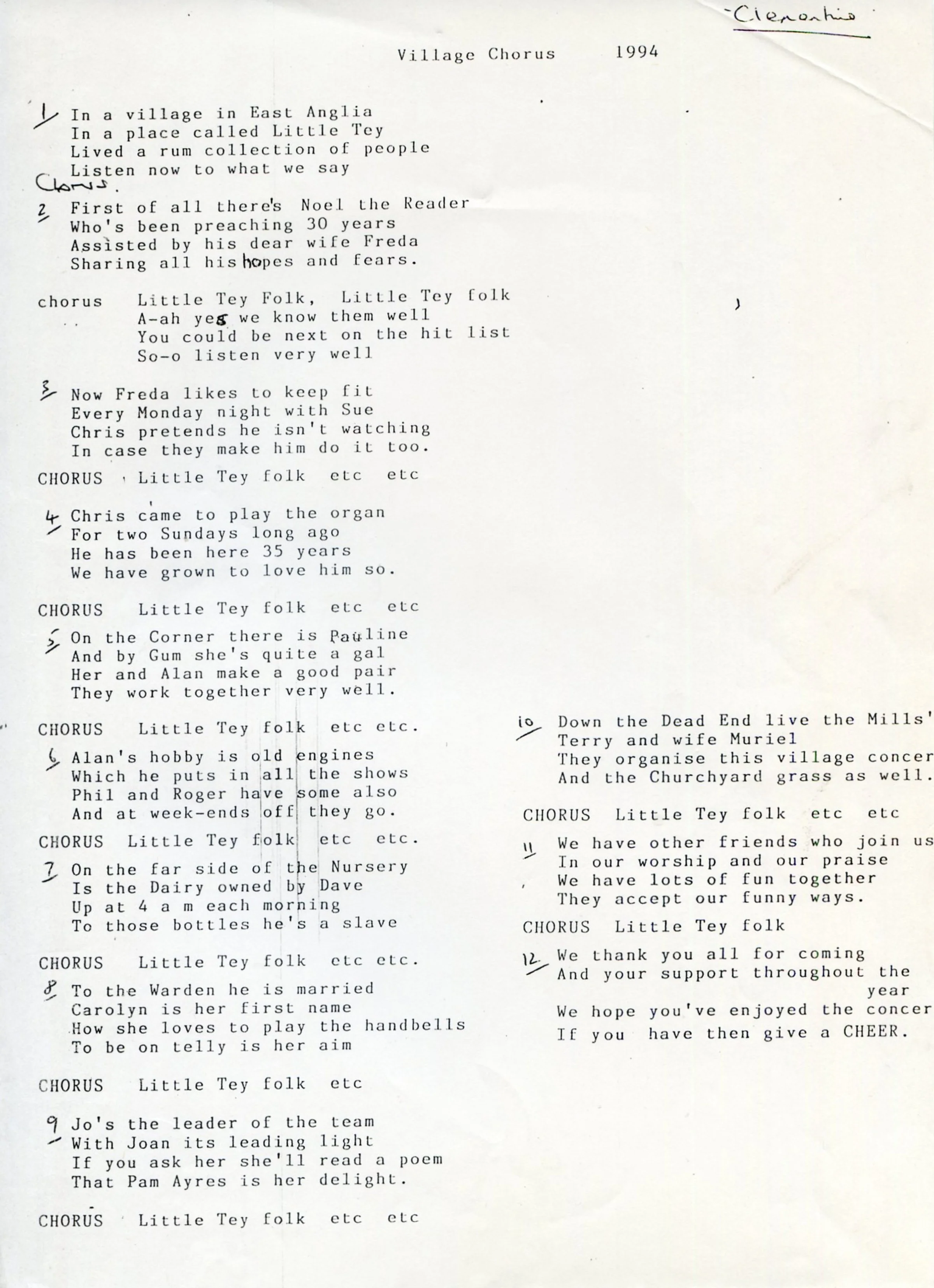 The programme for this concert is missing but these are the words for the song for audience participation, sung to the tune of Clementine and dated 1994. The verses refer to local residents! Maybe the song was used at a Harvest Supper?