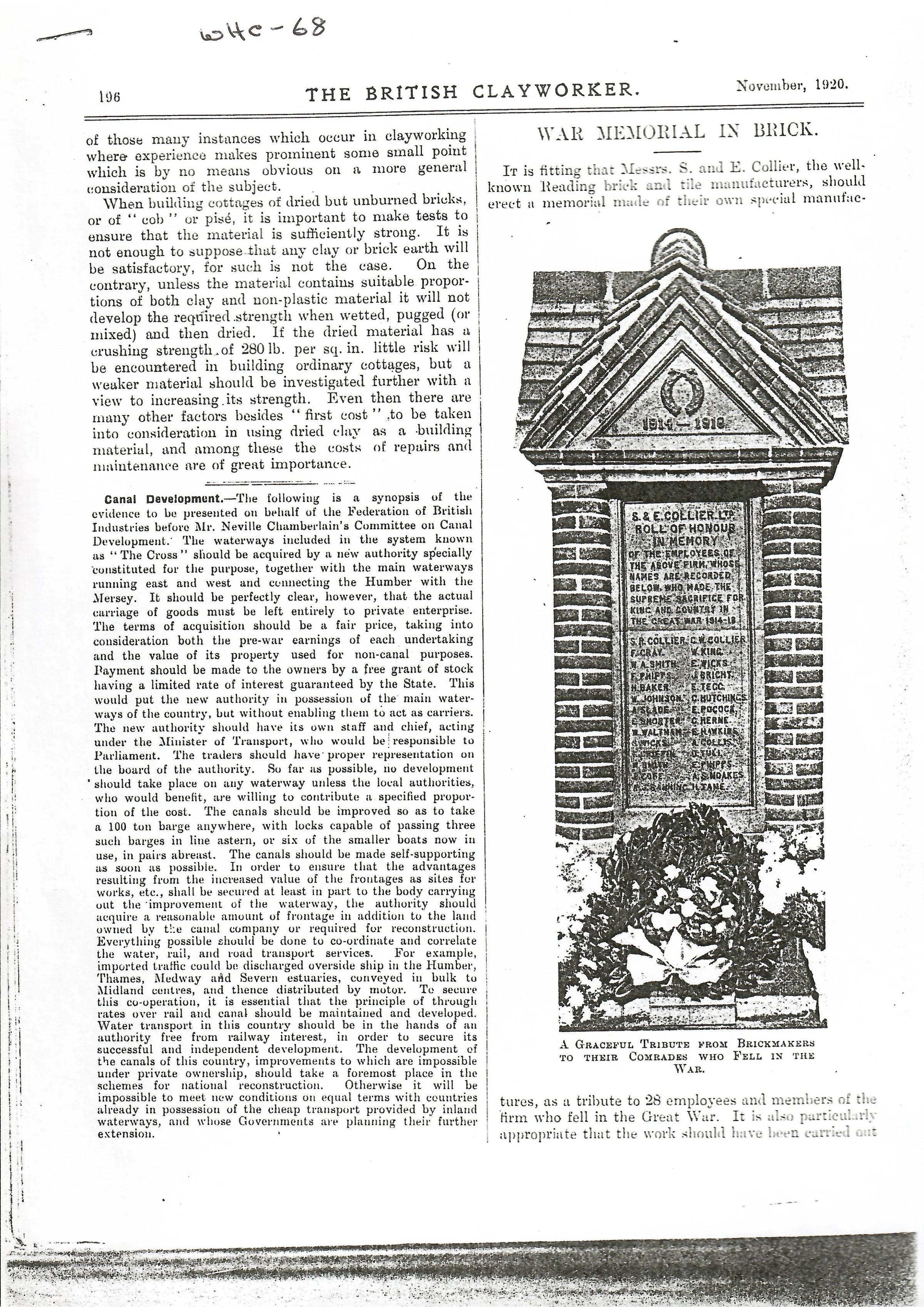 A short article displaying the war memorial opened at S E Collier Brickworks.